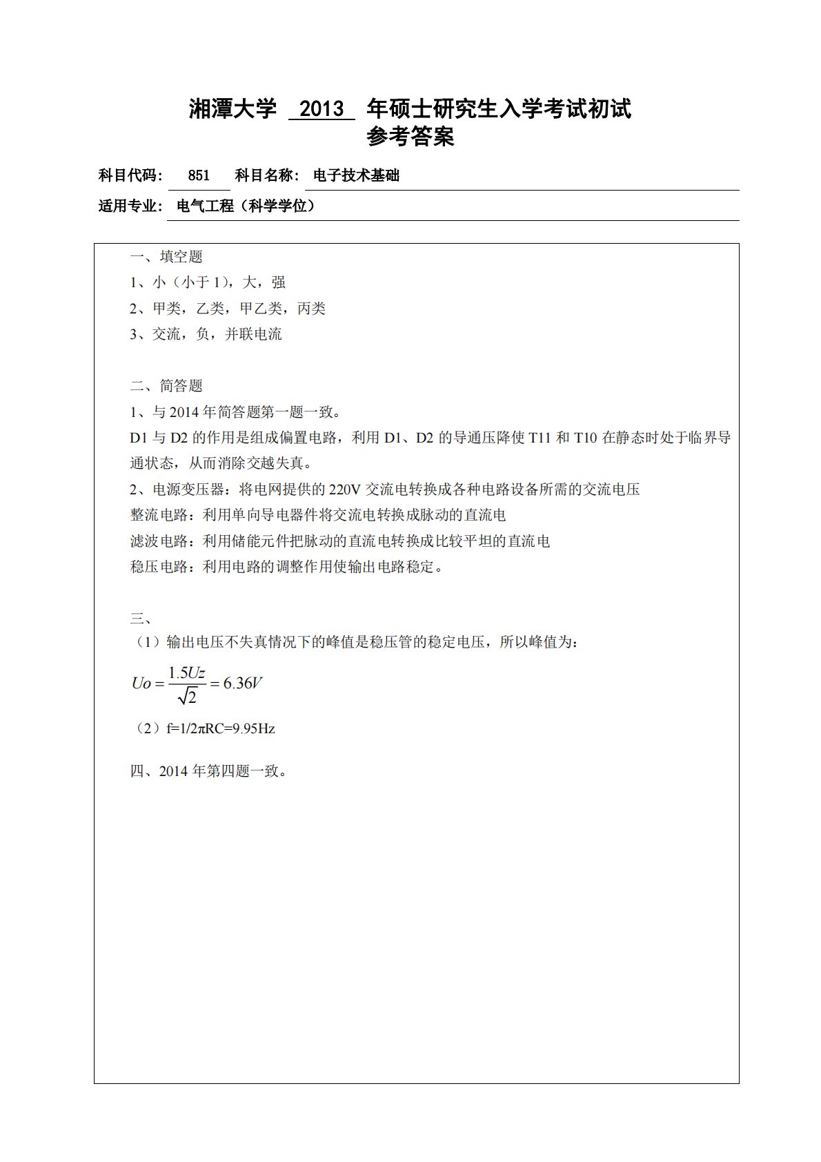 湘潭大学2013年硕士研究生入学考试初试参考答案科目代码:851科目名称:电子技术基础适用专业:电气工程(科学学位)一、填空题1、小(小于1),大,强2、甲类,乙类,甲乙类,丙类3、交流,负,并联电流二、简答题1、与2014年简答题第一题一致。D1与D2的作用是组成偏置电路,利用D1、D2的导通压降使T11和T10在静态时处于临界导通状态,从而消除交越失真。2、电源变压器:将电网提供的220V交流电转换成各种电路设备所需的交流电压整流电路:利用单向导电器件将交流电转换成脉动的直流电滤波电路:利用储能元件把脉动的直流电转换成比较平坦的直流电稳压电路:利用电路的调整作用使输出电路稳定。三、(1)输...