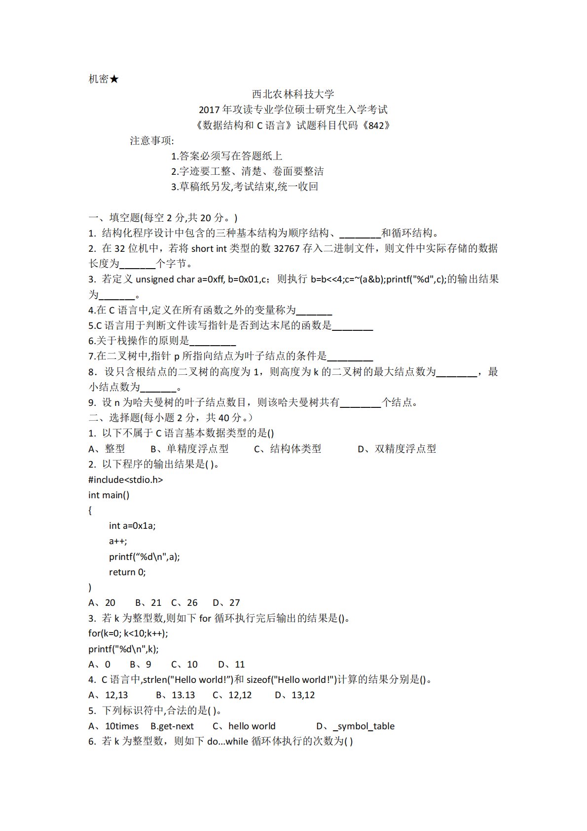 机密★西北农林科技大学2017年攻读专业学位硕士研究生入学考试《数据结构和C语言》试题科目代码《842》注意事项:1.答案必须写在答题纸上2.字迹要工整、清楚、卷面要整洁3.草稿纸另发,考试结束,统一收回一、填空题(每空2分,共20分。)1.结构化程序设计中包含的三种基本结构为顺序结构、________和循环结构。2.在32位机中,若将shortint类型的数32767存入二进制文件,则文件中实际存储的数据长度为_______个字节。3.若定义unsignedchara=0xff,b=0x01,c;则执行b=b