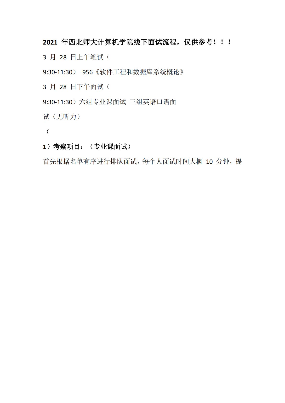 2021年西北师大计算机学院线下面试流程,仅供参考!!!3月28日上午笔试(9:30-11:30)956《软件工程和数据库系统概论》3月28日下午面试(9:30-11:30)六组专业课面试三组英语口语面试(无听力)(1)考察项目:(专业课面试)首先根据名单有序进行排队面试,每个人面试时间大概10分钟,提2021年西北师大计算机学院线下面试流程,仅供参考!!!3月28日上午笔试(9:30-11:30)956《软件工程和数据库系统概论》3月28日下午面试(9:30-11:30)六组专业课面试三组英语口语面试(无听力)(1)考察项目:(专业课面试)首先根据名单有序进行排队面试,每个人面试时间大概10...