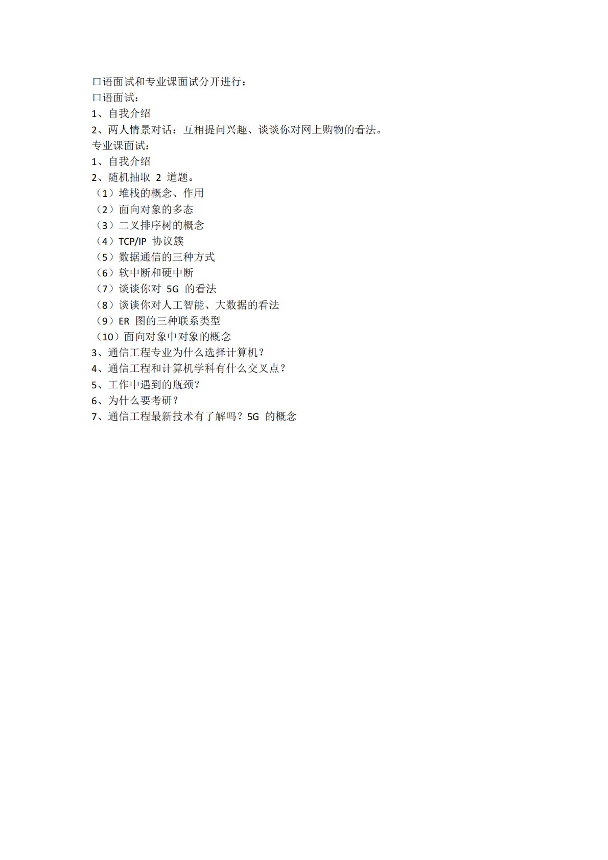 口语面试和专业课面试分开进行:口语面试:1、自我介绍2、两人情景对话:互相提问兴趣、谈谈你对网上购物的看法。专业课面试:1、自我介绍2、随机抽取2道题。(1)堆栈的概念、作用(2)面向对象的多态(3)二叉排序树的概念(4)TCP/IP协议簇(5)数据通信的三种方式(6)软中断和硬中断(7)谈谈你对5G的看法(8)谈谈你对人工智能、大数据的看法(9)ER图的三种联系类型(10)面向对象中对象的概念3、通信工程专业为什么选择计算机?4、通信工程和计算机学科有什么交叉点?5、工作中遇到的瓶颈?6、为什么要考研?7、通信工程最新技术有了解吗?5G的概念百校文库—海量高校资料共享库百校文库是一个线上大学...