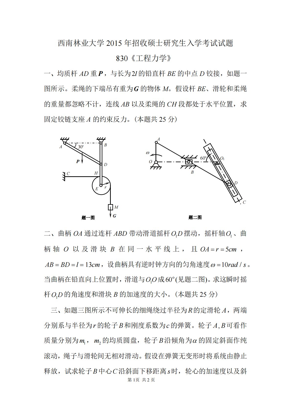 第1页共2页西南林业大学2015年招收硕士研究生入学考试试题830《工程力学》一、均质杆AD重P,与长为2l的铅直杆BE的中点D铰接,如题一图所示。柔绳的下端吊有重为G的物体M。假设杆BE、滑轮和柔绳的重量都忽略不计,连线AB以及柔绳的CH段都处于水平位置,求固定铰链支座A的约束反力。(本题共25分)二、曲柄OA通过连杆ABD带动滑道摇杆1OD摆动,摇杆轴1O、曲柄轴O以及滑块B在同一水平线上,且5OArcm,ABBDl13cm,设曲柄具有逆时钟方向的匀角速度10/rads。当曲柄在铅直向上位置时,滑道与1OO成o60(见题二图)。求这瞬时摇杆1OD的角速度和滑块B的加速度的大小...