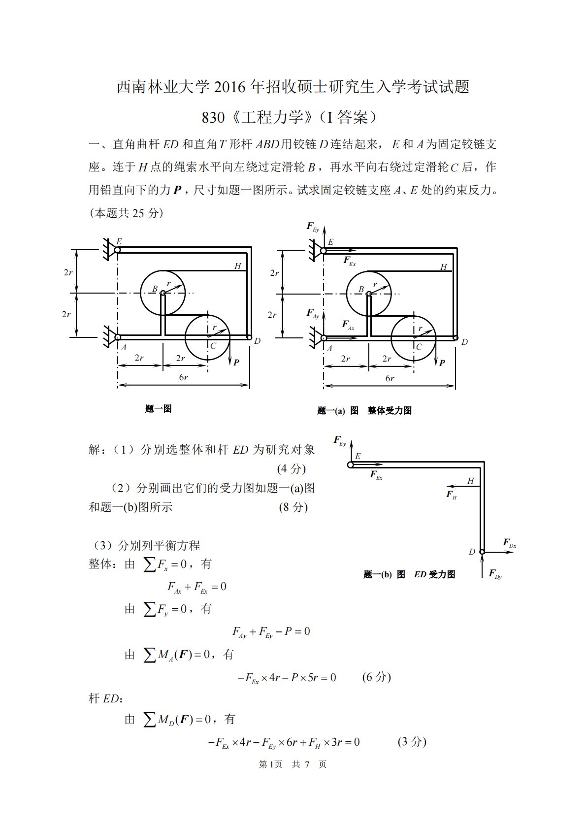 第1页共7页西南林业大学2016年招收硕士研究生入学考试试题830《工程力学》(I答案)一、直角曲杆ED和直角T形杆ABD用铰链D连结起来,E和A为固定铰链支座。连于H点的绳索水平向左绕过定滑轮B,再水平向右绕过定滑轮C后,作用铅直向下的力P,尺寸如题一图所示。试求固定铰链支座A、E处的约束反力。(本题共25分)解:(1)分别选整体和杆ED为研究对象(4分)(2)分别画出它们的受力图如题一(a)图和题一(b)图所示(8分)(3)分别列平衡方程整体:由0xF,有0AxExFF由0yF,有0AyEyFFP由()0AMF,有450ExFrPr(6分)杆ED:由()0D...