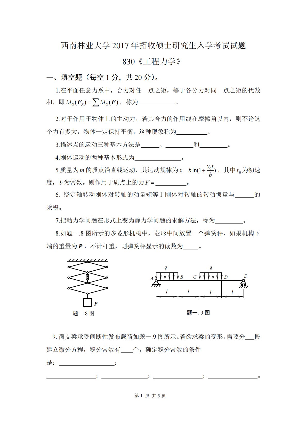 第1页共5页西南林业大学2017年招收硕士研究生入学考试试题830《工程力学》一、填空题(每空1分,共20分)。1.在平面任意力系中,合力对任一点之矩,等于各分力对同一点之矩的代数和,即()()OROMMFF,称为。2.对于作用于物体上的主动力,若其合力的作用线在摩擦角以内,则不论这个力有多大,物体一定保持平衡,这种现象称为。3.描述点的运动三种基本方法是、和。4.刚体运动的两种基本形式为。5.质量为m的质点沿直线运动,其运动规律为0ln(1)vtxbb,其中0v为初速度,b为常数。则作用于质点上的力F。6.绕定轴转动刚体对转轴的动量矩等于刚体对转轴的转动惯量与的乘积。7.把动力学问...
