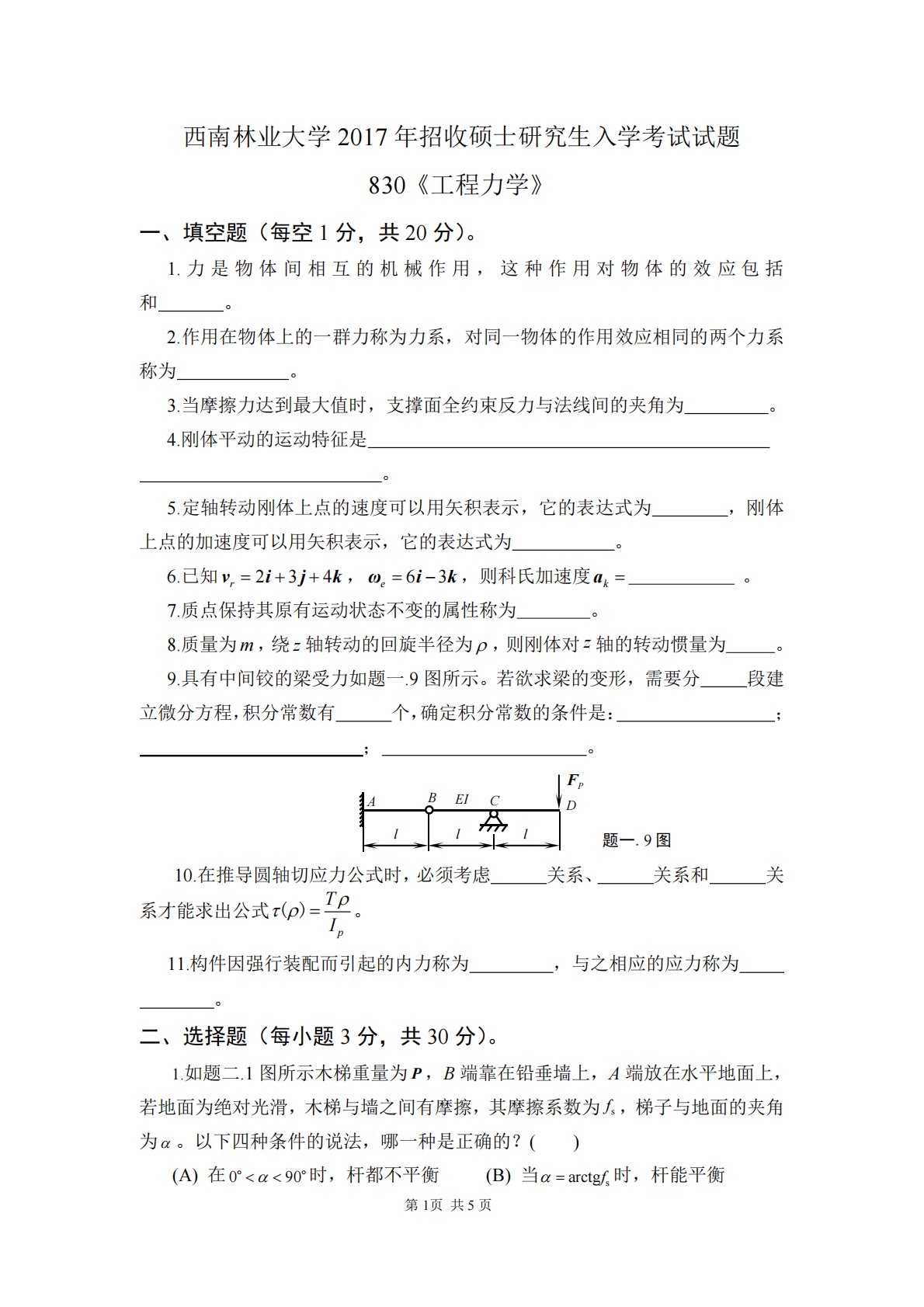 第1页共5页西南林业大学2017年招收硕士研究生入学考试试题830《工程力学》一、填空题(每空1分,共20分)。1.力是物体间相互的机械作用,这种作用对物体的效应包括和。2.作用在物体上的一群力称为力系,对同一物体的作用效应相同的两个力系称为。3.当摩擦力达到最大值时,支撑面全约束反力与法线间的夹角为。4.刚体平动的运动特征是。5.定轴转动刚体上点的速度可以用矢积表示,它的表达式为,刚体上点的加速度可以用矢积表示,它的表达式为。6.已知234rvijk,63eωik,则科氏加速度ka。7.质点保持其原有运动状态不变的属性称为。8.质量为m,绕z轴转动的回旋半径为,则刚体对z轴的转...
