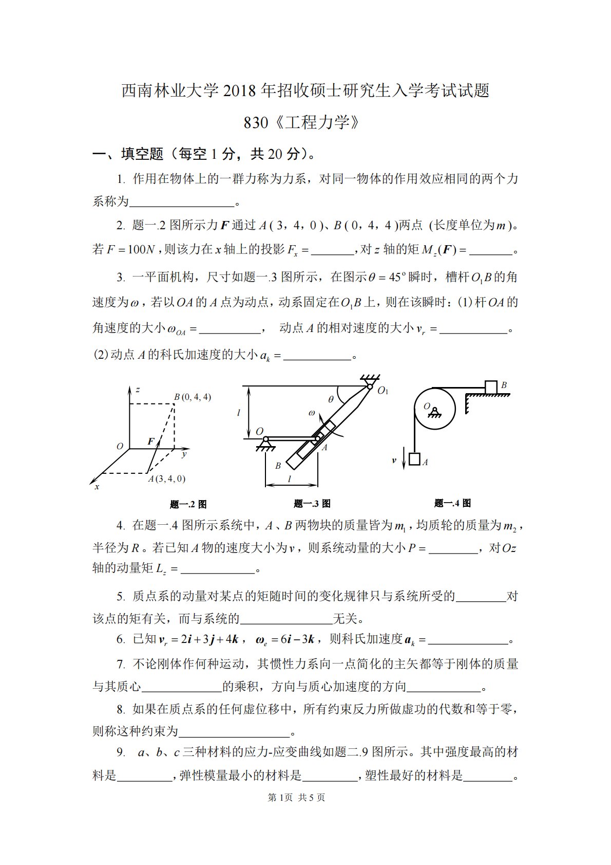 第1页共5页西南林业大学2018年招收硕士研究生入学考试试题830《工程力学》一、填空题(每空1分,共20分)。1.作用在物体上的一群力称为力系,对同一物体的作用效应相同的两个力系称为。2.题一.2图所示力F通过A(3,4,0)、B(0,4,4)两点(长度单位为m)。若NF100,则该力在x轴上的投影xF,对z轴的矩)(FzM。3.一平面机构,尺寸如题一.3图所示,在图示o45瞬时,槽杆BO1的角速度为,若以OA的A点为动点,动系固定在BO1上,则在该瞬时:(1)杆OA的角速度的大小OA,动点A的相对速度的大小rv。(2)动点A的科氏加速度的大小ka。4.在题一.4图所示系...