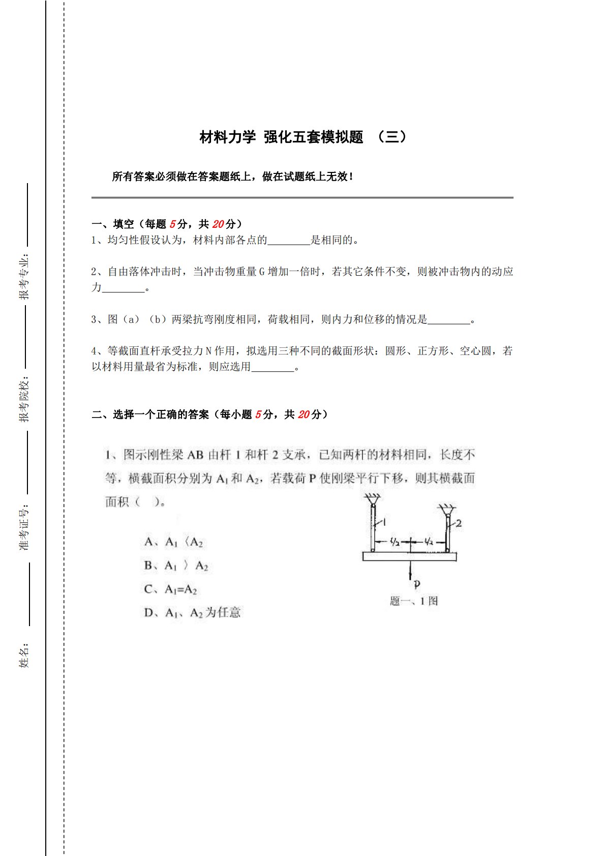 材料力学强化五套模拟题(三)所有答案必须做在答案题纸上,做在试题纸上无效!一、填空(每题5分,共20分)1、均匀性假设认为,材料内部各点的是相同的。2、自由落体冲击时,当冲击物重量G增加一倍时,若其它条件不变,则被冲击物内的动应力。3、图(a)(b)两梁抗弯刚度相同,荷载相同,则内力和位移的情况是。4、等截面直杆承受拉力N作用,拟选用三种不同的截面形状:圆形、正方形、空心圆,若以材料用量最省为标准,则应选用。二、选择一个正确的答案(每小题5分,共20分)姓名:准考证号:报考院校:报考专业:4、自由落体冲击时,当冲击物重量G增加一倍时,若其它条件不变,则被冲击物内的动应力。A.不变B.增加不足一...