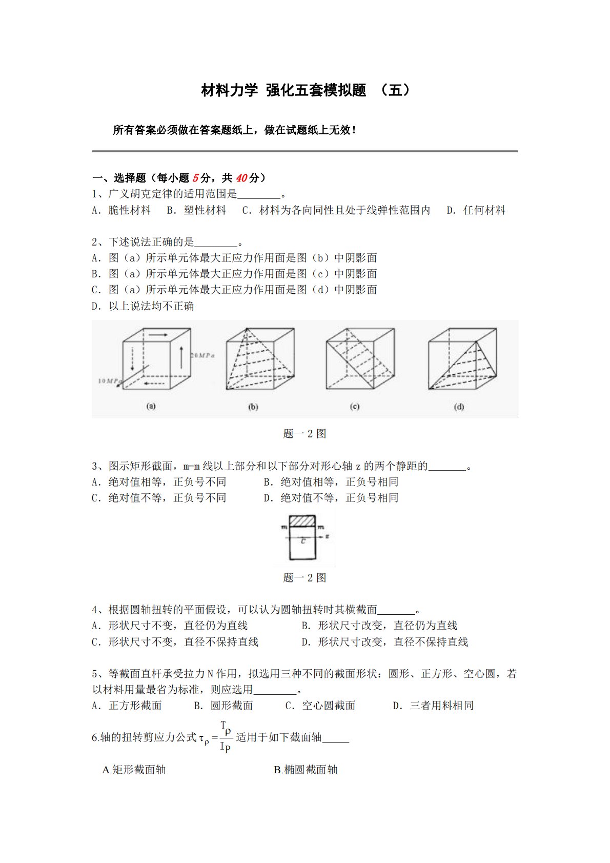 材料力学强化五套模拟题(五)所有答案必须做在答案题纸上,做在试题纸上无效!一、选择题(每小题5分,共40分)1、广义胡克定律的适用范围是。A.脆性材料B.塑性材料C.材料为各向同性且处于线弹性范围内D.任何材料2、下述说法正确的是。A.图(a)所示单元体最大正应力作用面是图(b)中阴影面B.图(a)所示单元体最大正应力作用面是图(c)中阴影面C.图(a)所示单元体最大正应力作用面是图(d)中阴影面D.以上说法均不正确题一2图3、图示矩形截面,m-m线以上部分和以下部分对形心轴z的两个静距的。A.绝对值相等,正负号不同B.绝对值相等,正负号相同C.绝对值不等,正负号不同D.绝对值不等,正负号相同...