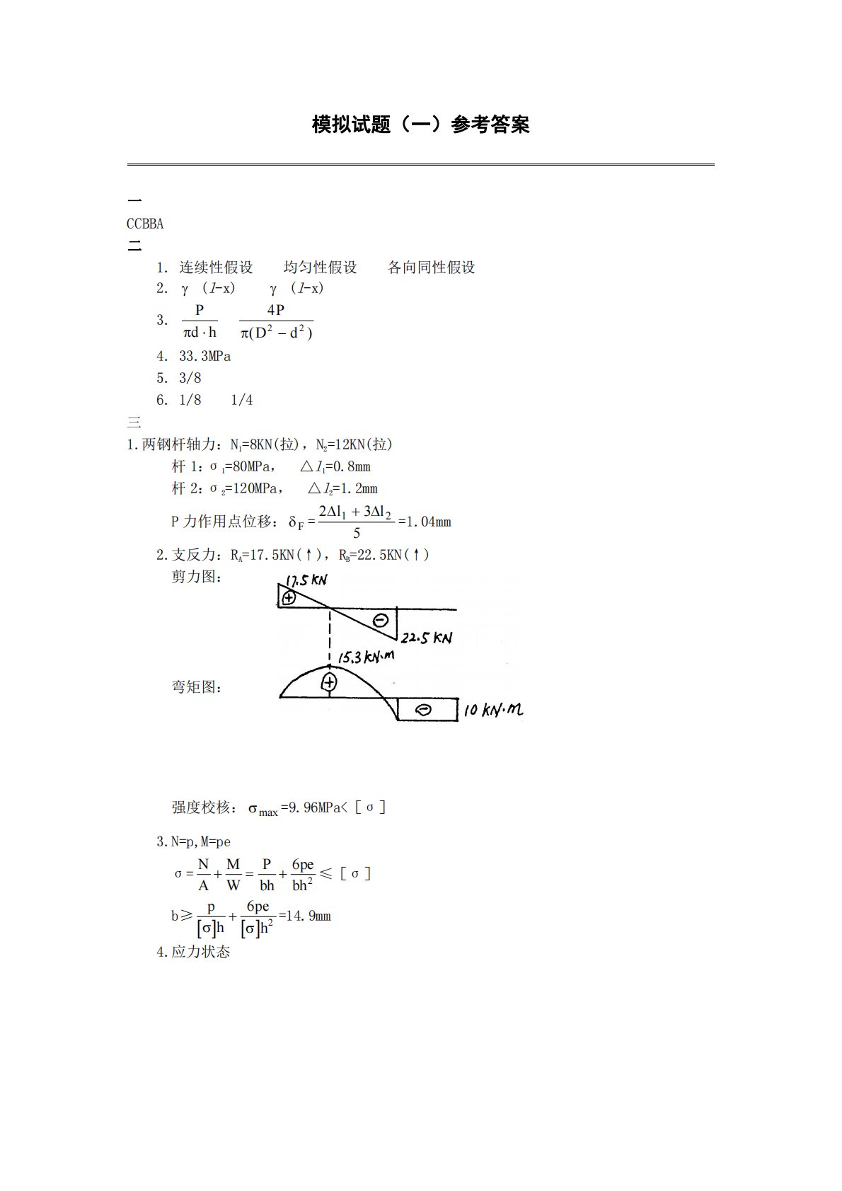 模拟试题(一)参考答案一CCBBA二1.连续性假设均匀性假设各向同性假设2.(l-x)(l-x)3.Pdh422PDd()4.33.3MPa5.3/86.1/81/4三1.两钢杆轴力:N1=8KN(拉),N2=12KN(拉)杆1:σ1=80MPa,△l1=0.8mm杆2:σ2=120MPa,△l2=1.2mmP力作用点位移:F=23512ll=1.04mm2.支反力:RA=17.5KN(↑),RB=22.5KN(↑)剪力图:弯矩图:强度校核:max=9.96MPa<[σ]3.N=p,M=peσ=NAMWPbhpebh62≤[σ]b≥phpeh62=14...