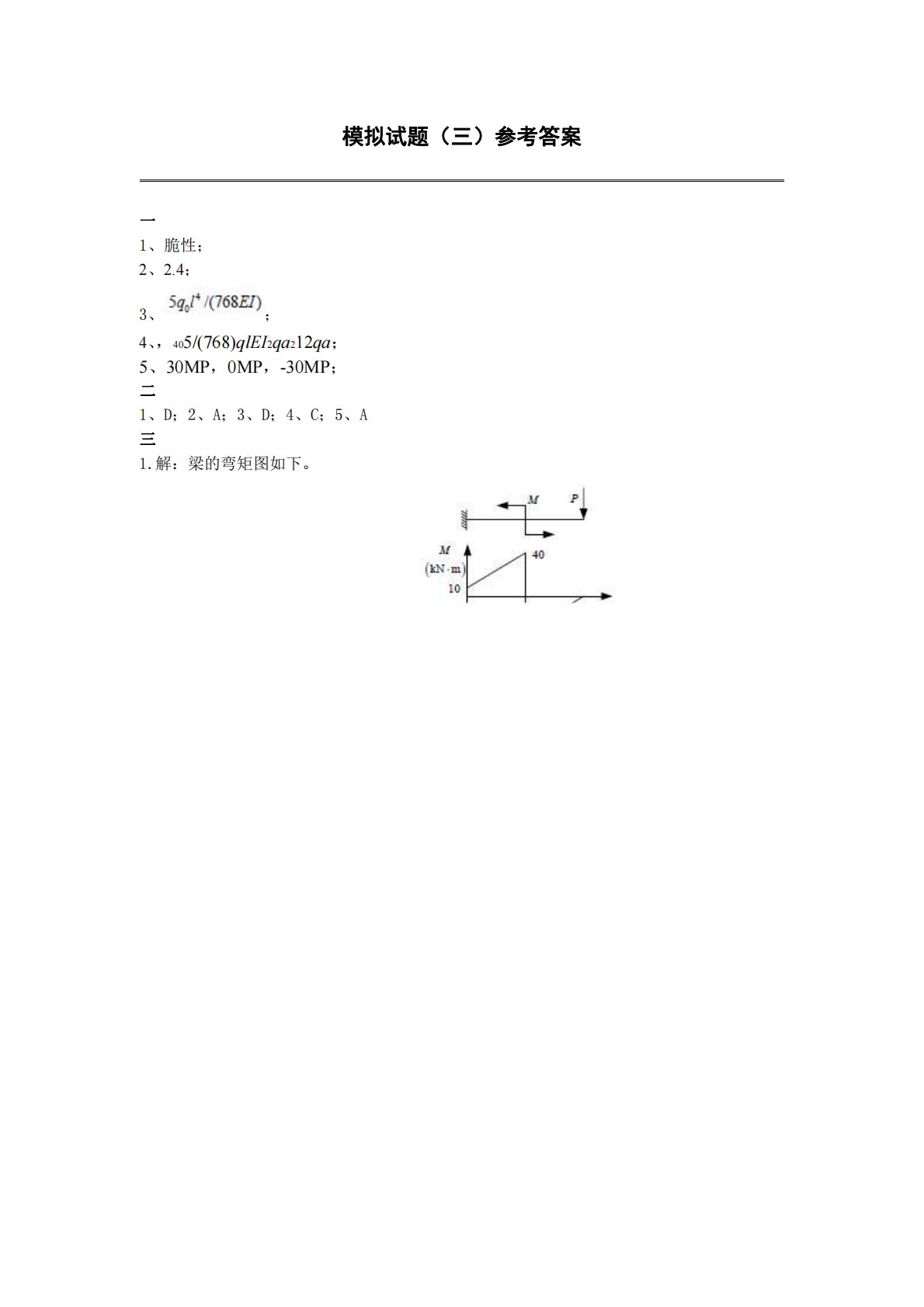 模拟试题(三)参考答案一1、脆性;2、2.4;3、;4、,405/(768)qlEI2qa212qa;5、30MP,0MP,-30MP;二1、D;2、A;3、D;4、C;5、A三1.解:梁的弯矩图如下。模拟试题(三)参考答案一1、脆性;2、2.4;3、;4、,405/(768)qlEI2qa212qa;5、30MP,0MP,-30MP;二1、D;2、A;3、D;4、C;5、A三1.解:梁的弯矩图如下。由图知:6max4010NmmM+=×⋅s21,6max3010NmmM−s23=×⋅s21(1分)。()max1max225060.2MPa28.4MPaCtzCtzMyIMyIσσ+−s23⎧...