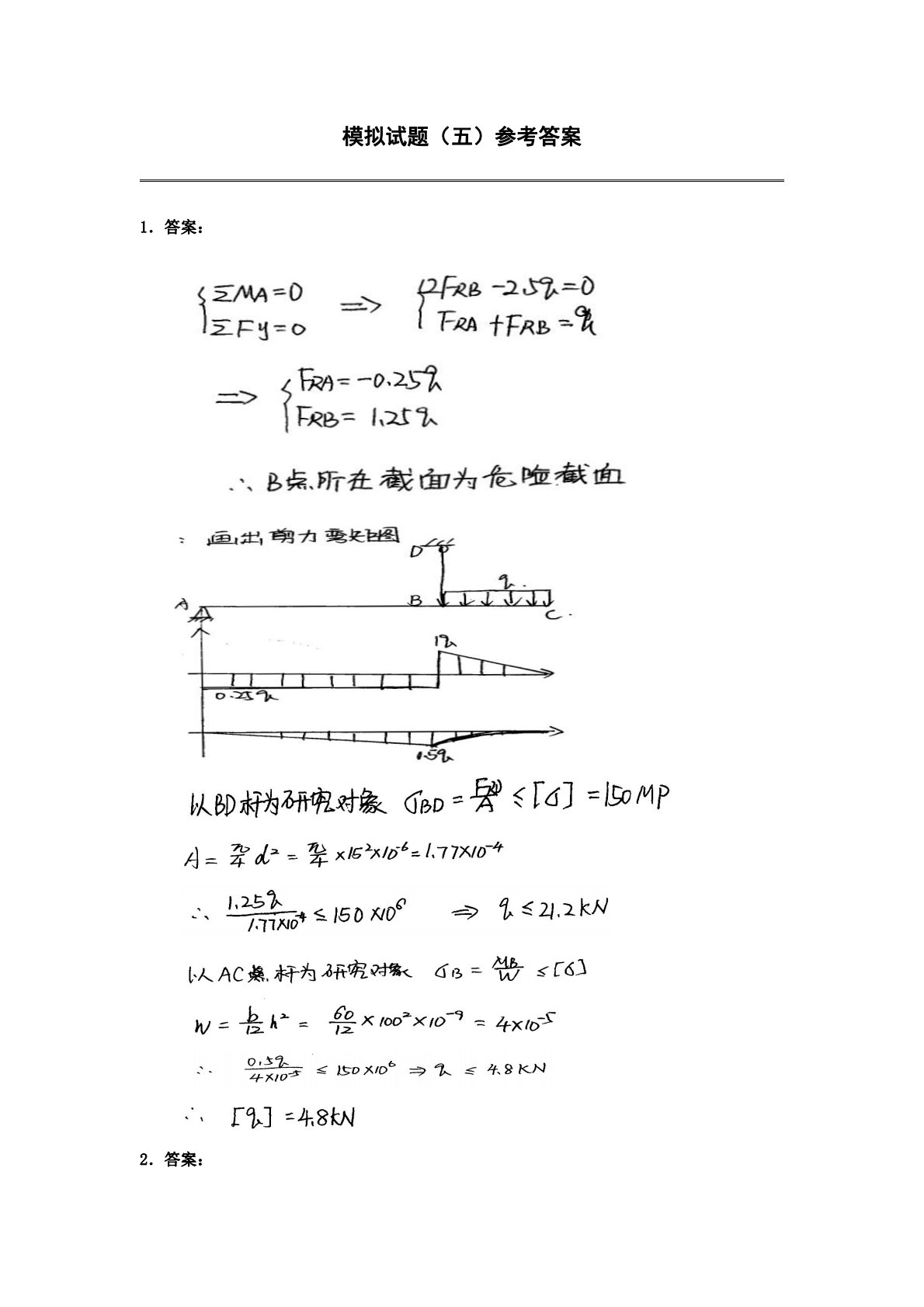 模拟试题(五)参考答案1.答案:2.答案:3.答案“解;上表面A点处的应力状态如图,mNdEMEEmNEWMMpaEWMzz9811612/112/1222;258948102401020034502450004545450450450169010塑性材料用第三强度理论进行校核:MpaMMdMMWxzr93321222132234.答案:解:1、外力分析:将载荷向B点简化,22,2qlMq...