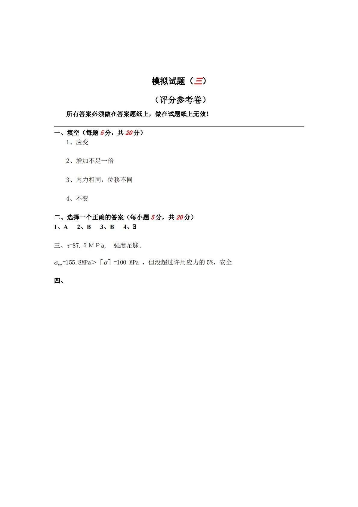 模拟试题(三)(评分参考卷)所有答案必须做在答案题纸上,做在试题纸上无效!一、填空(每题5分,共20分)1、应变2、增加不足一倍3、内力相同,位移不同4、不变二、选择一个正确的答案(每小题5分,共20分)1、A2、B3、B4、B三、=87.5MPa,强度足够.max=155.8MPa>[]=100MPa,但没超过许用应力的5%,安全四、五、六、七、解:做出梁的弯矩图如右所示:(1)对于整体截面梁:故:(2)对于两根方木叠置由于这是两个相同的方木叠合而成,且其之间不加任何的联系,故有八、九、图示薄壁圆筒内径,壁厚,材料弹性模量,泊松比。为测量内压,可以沿周向贴应变片A,也可以沿轴向贴应变片...