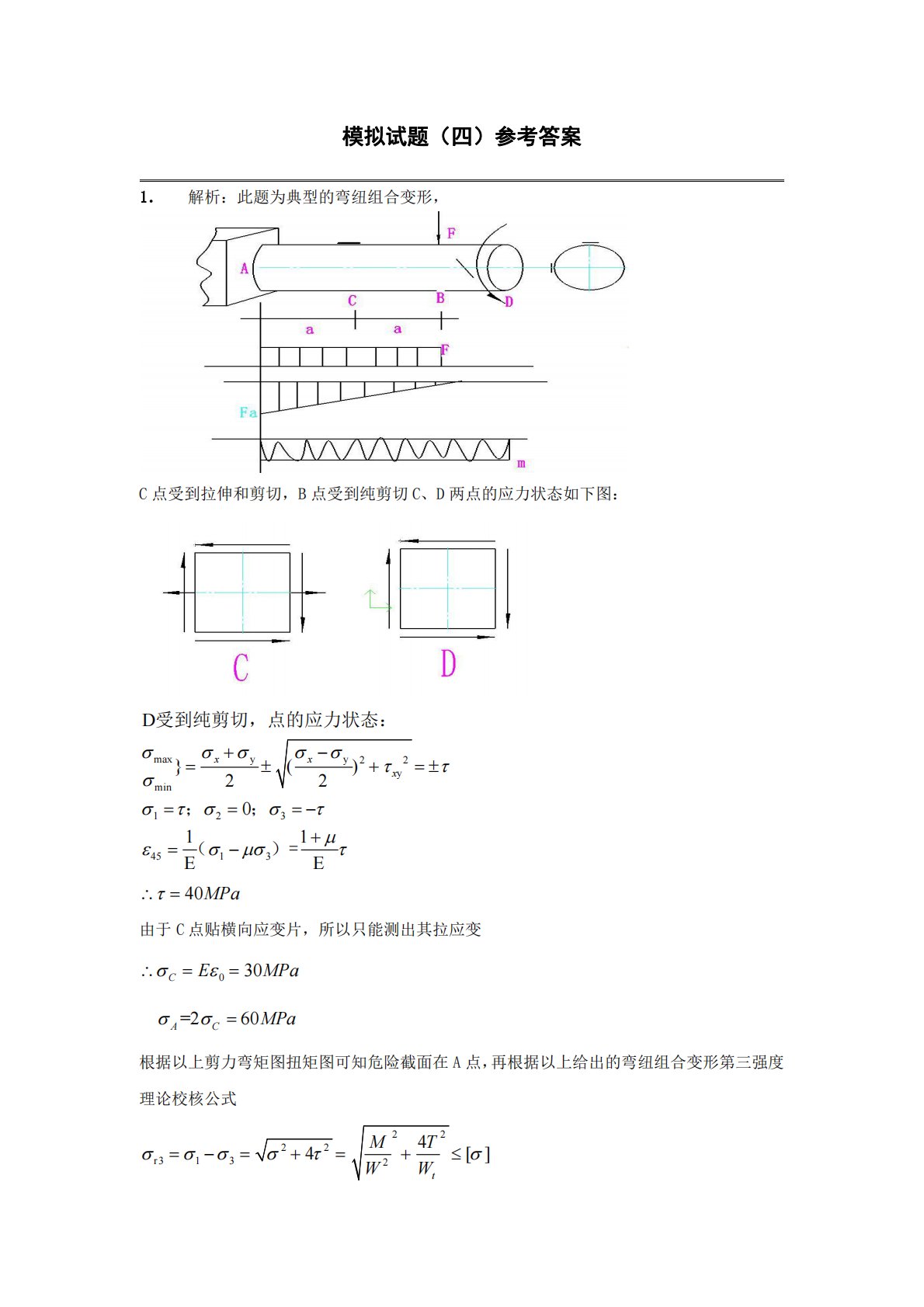 模拟试题(四)参考答案1.解析:此题为典型的弯纽组合变形,C点受到拉伸和剪切,B点受到纯剪切C、D两点的应力状态如下图:yymax22ymin1234513D}()22011EExxx受到纯剪切,点的应力状态:;;()=40MPa由于C点贴横向应变片,所以只能测出其拉应变030CEMPa=260ACMPa根据以上剪力弯矩图扭矩图可知危险截面在A点,再根据以上给出的弯纽组合变形第三强度理论校核公式2222r313244[]tMTWW得:223472[]rMPa所以次梁...