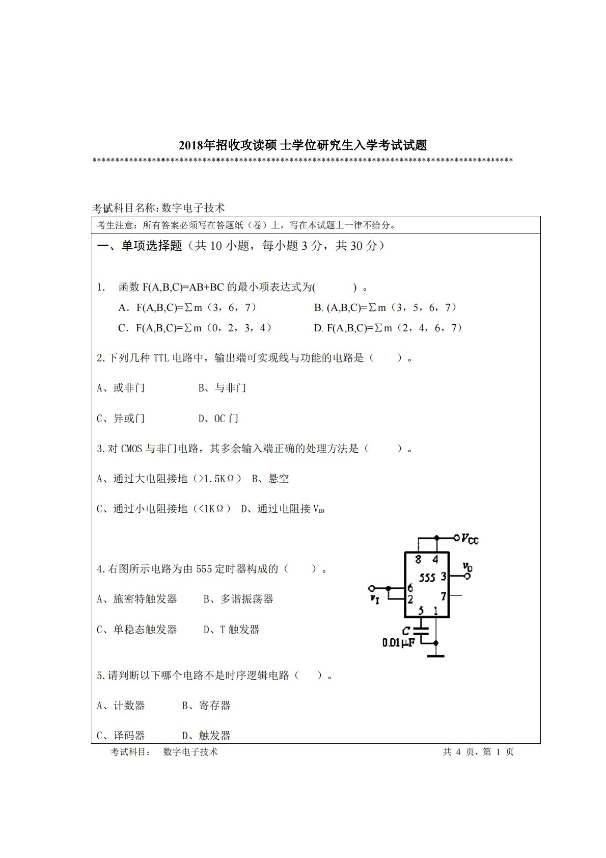 ****考试考生一1.2.下A、C、3.对A、C、4.右A、C、5.请A、C、*************生注意:所有答、单项选择函数F(A,BA.F(A,BC.F(A,B,下列几种TT或非门异或门对CMOS与非通过大电阻通过小电阻右图所示电路施密特触发单稳态触发请判断以下哪计数器译码器考试科目:数答案必须写在试科目名称:数*************字电子技术答择题(共10B,C)=AB+BC,C)=∑m(3,C)=∑m(0L电路中,输B、与D、O非门电路,其阻接地(>1.5阻接地(