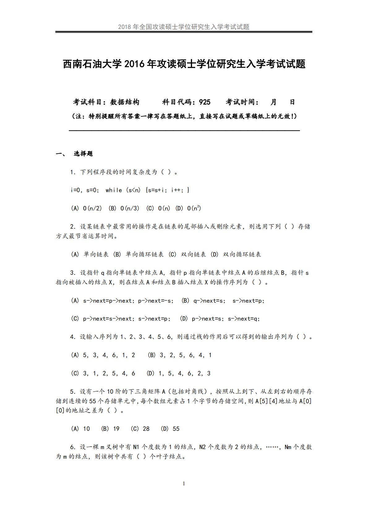 2018年全国攻读硕士学位研究生入学考试试题1西南石油大学2016年攻读硕士学位研究生入学考试试题考试科目:数据结构科目代码:925考试时间:月日(注:特别提醒所有答案一律写在答题纸上,直接写在试题或草稿纸上的无效!)———————————————————————————————一、选择题1.下列程序段的时间复杂度为()。i=0,s=0;while(snext=p->next;p->next=-s;(B)q->next=s;s->next=p;(C)p->next=s->next;s->next=p;(D)p->next=s;s->next=q;4.设输入序列为1、2、3、4、5、6,则通过栈...