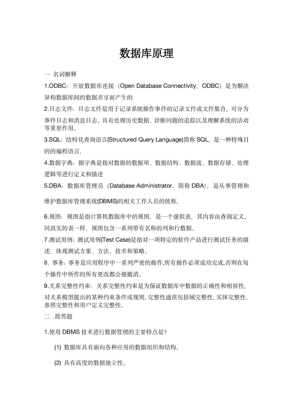 数据库原理一名词解释1.ODBC:开放数据库连接(OpenDatabaseConnectivity,ODBC)是为解决异构数据库间的数据共享而产生的2.日志文件:日志文件是用于记录系统操作事件的记录文件或文件集合,可分为事件日志和消息日志。具有处理历史数据、诊断问题的追踪以及理解系统的活动等重要作用。3.SQL:结构化查询语言(StructuredQueryLanguage)简称SQL,是一种特殊目的的编程语言,4.数据字典:据字典是指对数据的数据项、数据结构、数据流、数据存储、处理逻辑等进行定义和描述5.DBA:数据库管理员(DatabaseAdministrator,简称DBA),是从事管...