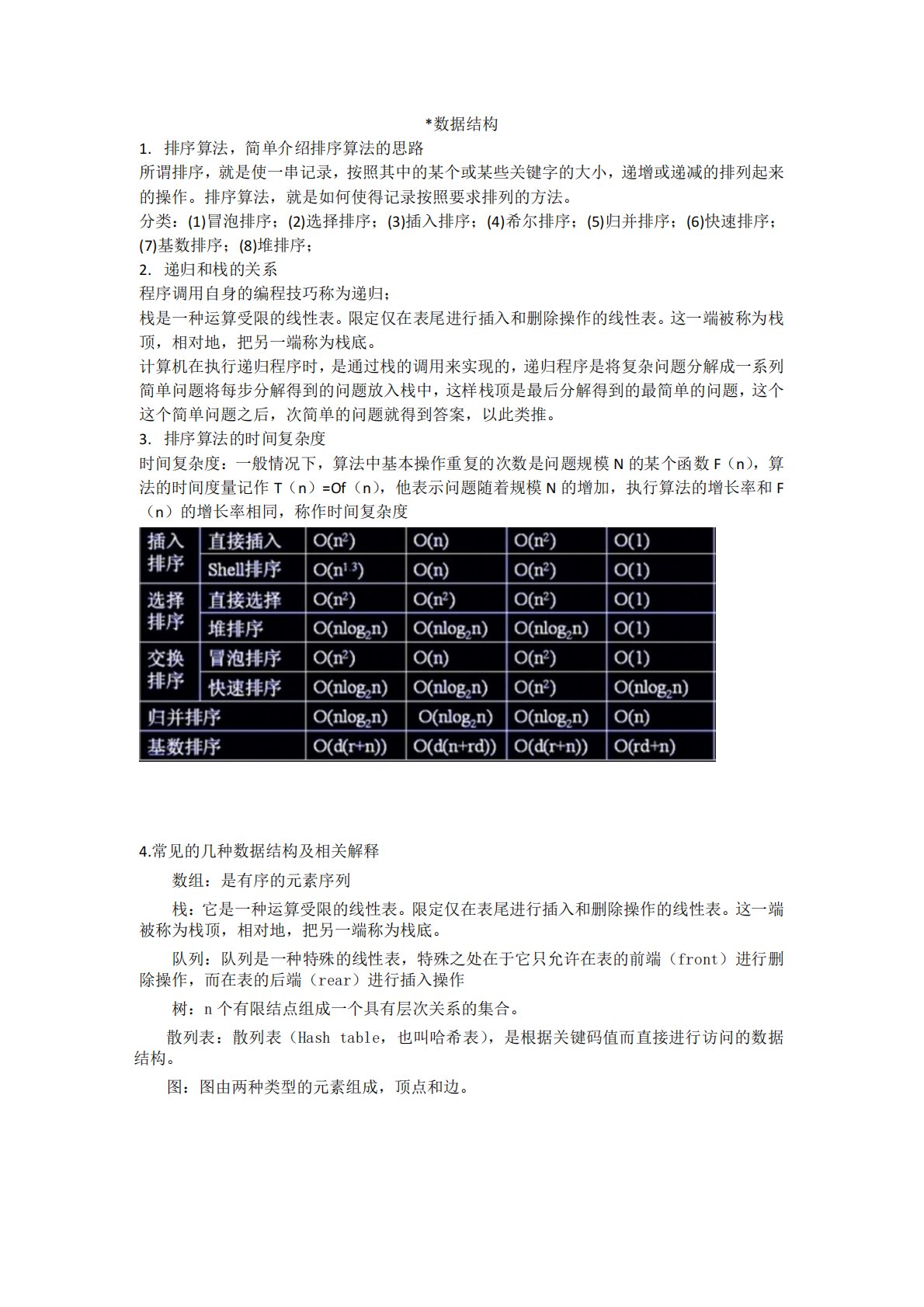 *数据结构1.排序算法,简单介绍排序算法的思路所谓排序,就是使一串记录,按照其中的某个或某些关键字的大小,递增或递减的排列起来的操作。排序算法,就是如何使得记录按照要求排列的方法。分类:(1)冒泡排序;(2)选择排序;(3)插入排序;(4)希尔排序;(5)归并排序;(6)快速排序;(7)基数排序;(8)堆排序;2.递归和栈的关系程序调用自身的编程技巧称为递归;栈是一种运算受限的线性表。限定仅在表尾进行插入和删除操作的线性表。这一端被称为栈顶,相对地,把另一端称为栈底。计算机在执行递归程序时,是通过栈的调用来实现的,递归程序是将复杂问题分解成一系列简单问题将每步分解得到的问题放入栈中,这样栈顶是...