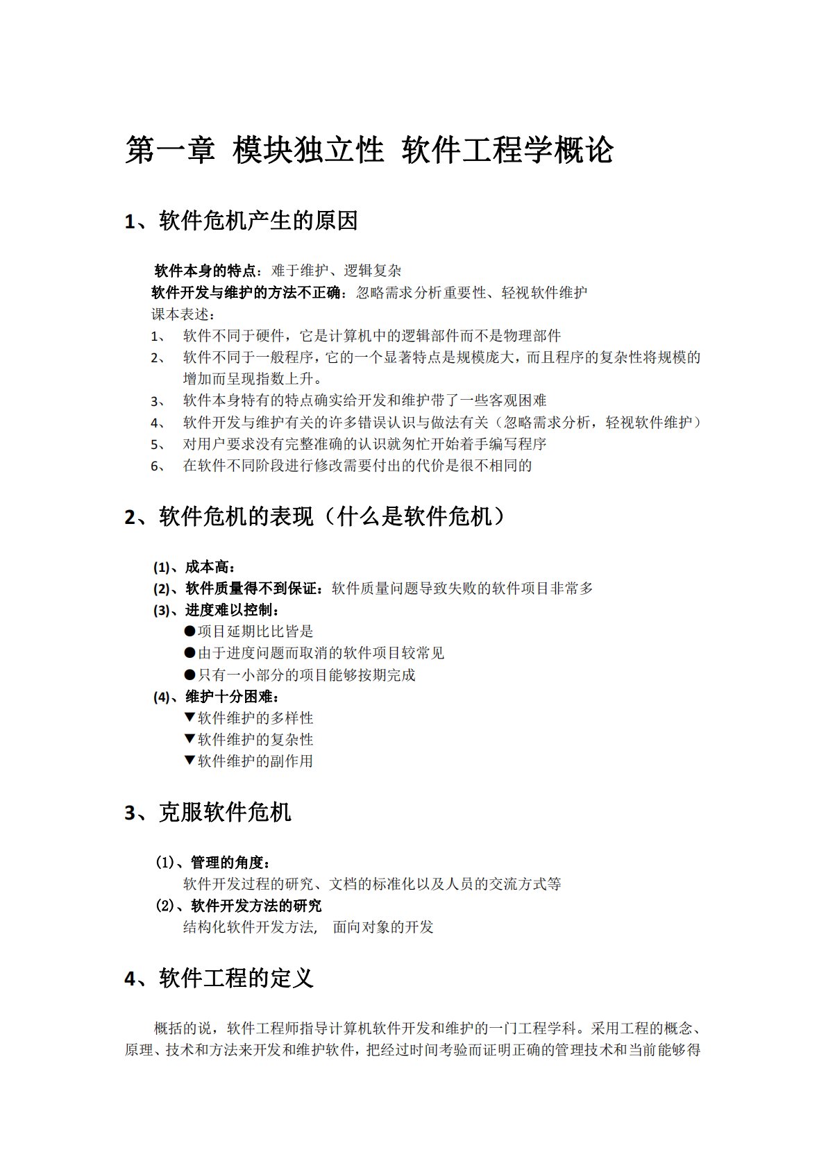 第一章模块独立性软件工程学概论1、软件危机产生的原因软件本身的特点:难于维护、逻辑复杂软件开发与维护的方法不正确:忽略需求分析重要性、轻视软件维护课本表述:1、软件不同于硬件,它是计算机中的逻辑部件而不是物理部件2、软件不同于一般程序,它的一个显著特点是规模庞大,而且程序的复杂性将规模的增加而呈现指数上升。3、软件本身特有的特点确实给开发和维护带了一些客观困难4、软件开发与维护有关的许多错误认识与做法有关(忽略需求分析,轻视软件维护)5、对用户要求没有完整准确的认识就匆忙开始着手编写程序6、在软件不同阶段进行修改需要付出的代价是很不相同的2、软件危机的表现(什么是软件危机)(1)、成本高:(2...