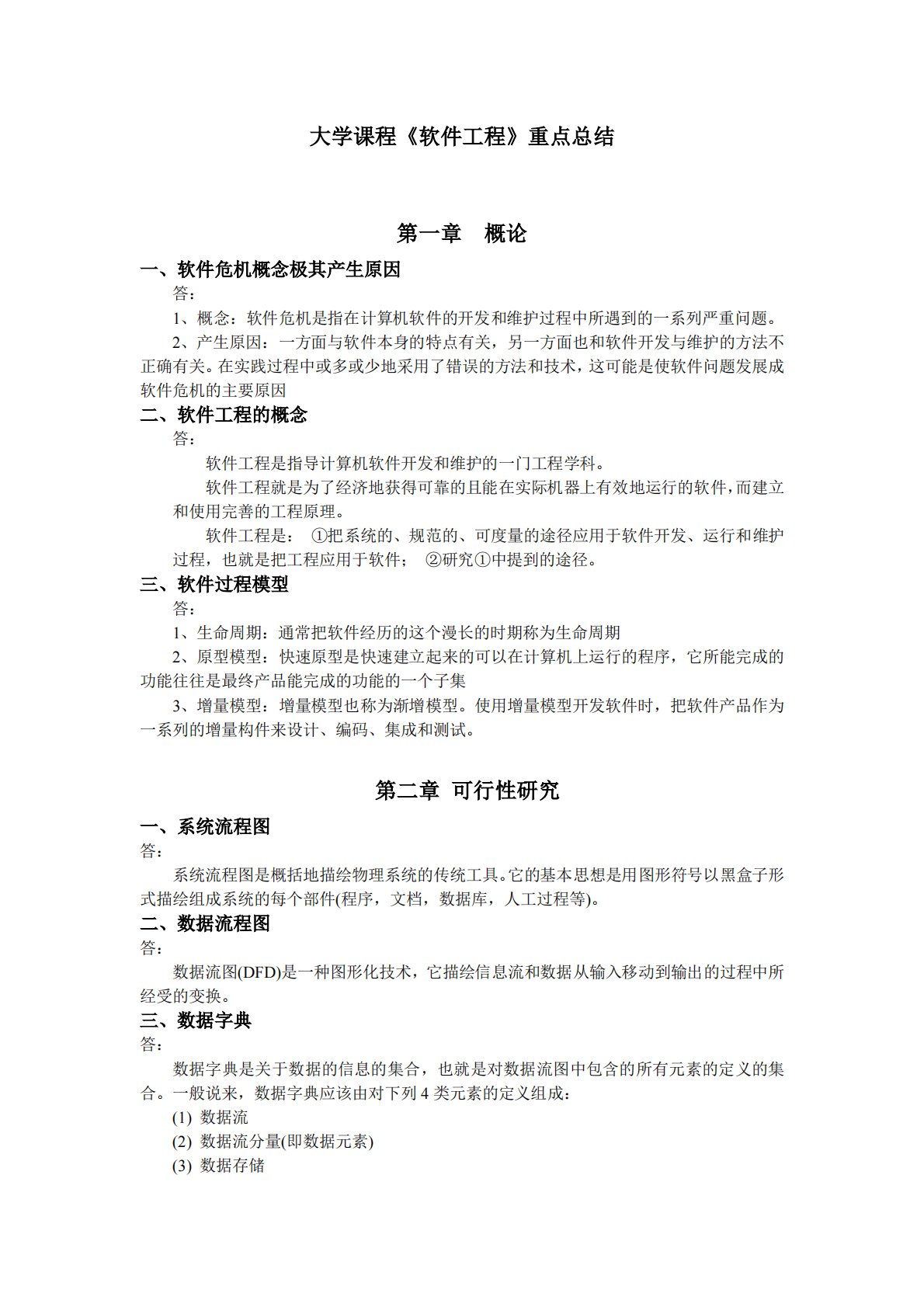 大学课程《软件工程》重点总结第一章概论一、软件危机概念极其产生原因答:1、概念:软件危机是指在计算机软件的开发和维护过程中所遇到的一系列严重问题。2、产生原因:一方面与软件本身的特点有关,另一方面也和软件开发与维护的方法不正确有关。在实践过程中或多或少地采用了错误的方法和技术,这可能是使软件问题发展成软件危机的主要原因二、软件工程的概念答:软件工程是指导计算机软件开发和维护的一门工程学科。软件工程就是为了经济地获得可靠的且能在实际机器上有效地运行的软件,而建立和使用完善的工程原理。软件工程是:①把系统的、规范的、可度量的途径应用于软件开发、运行和维护过程,也就是把工程应用于软件;②研究①中提到...