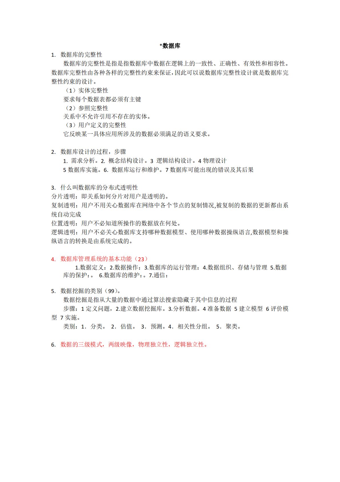*数据库1.数据库的完整性数据库的完整性是指是指数据库中数据在逻辑上的一致性、正确性、有效性和相容性。数据库完整性由各种各样的完整性约束来保证,因此可以说数据库完整性设计就是数据库完整性约束的设计。(1)实体完整性要求每个数据表都必须有主键(2)参照完整性关系中不允许引用不存在的实体。(3)用户定义的完整性它反映某一具体应用所涉及的数据必须满足的语义要求。2.数据库设计的过程,步骤1.需求分析。2.概念结构设计。3逻辑结构设计。4物理设计5数据库实施。6.数据库运行和维护。7数据库可能出现的错误及其后果3.什么叫数据库的分布式透明性分片透明:即关系如何分片对用户是透明的。复制透明:用户不用关心...