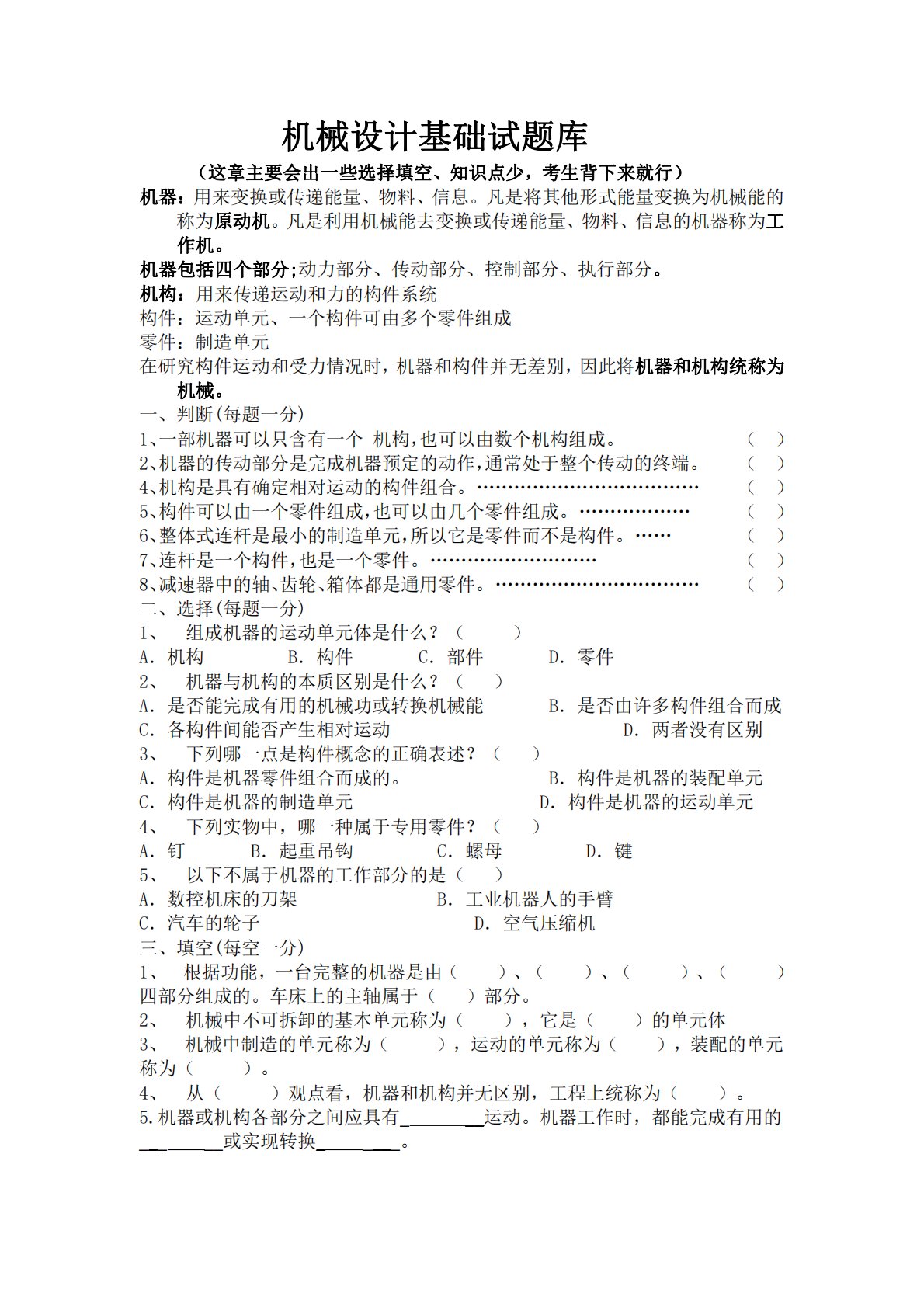 机械设计基础试题库(这章主要会出一些选择填空、知识点少,考生背下来就行)机器:用来变换或传递能量、物料、信息。凡是将其他形式能量变换为机械能的称为原动机。凡是利用机械能去变换或传递能量、物料、信息的机器称为工作机。机器包括四个部分;动力部分、传动部分、控制部分、执行部分。机构:用来传递运动和力的构件系统构件:运动单元、一个构件可由多个零件组成零件:制造单元在研究构件运动和受力情况时,机器和构件并无差别,因此将机器和机构统称为机械。一、判断(每题一分)1、一部机器可以只含有一个机构,也可以由数个机构组成。()2、机器的传动部分是完成机器预定的动作,通常处于整个传动的终端。()4、机构是具有确定相...