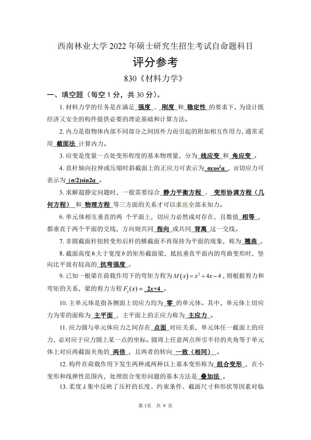 第1页共9页西南林业大学2022年硕士研究生招生考试自命题科目评分参考830《材料力学》一、填空题(每空1分,共30分)。1.材料力学的任务是在满足强度、刚度和稳定性的要求下,为设计既经济又安全的构件提供必要的理论基础和计算方法。2.内力是指物体内部不同部分之间因外力而引起的附加相互作用力,通常采用截面法计算内力。3.应变是度量一点处变形程度的基本物理量,分为线应变和角应变。4.直杆轴向拉伸或压缩时斜截面上的正应力可表示为σcos2α,而切应力可表示为(σ/2)sin2α。5.求解超静定问题时,一般需要综合静力平衡方程、变形协调方程(几何方程)和物理方程等三方面的关系才可以求出全部未知力。6....
