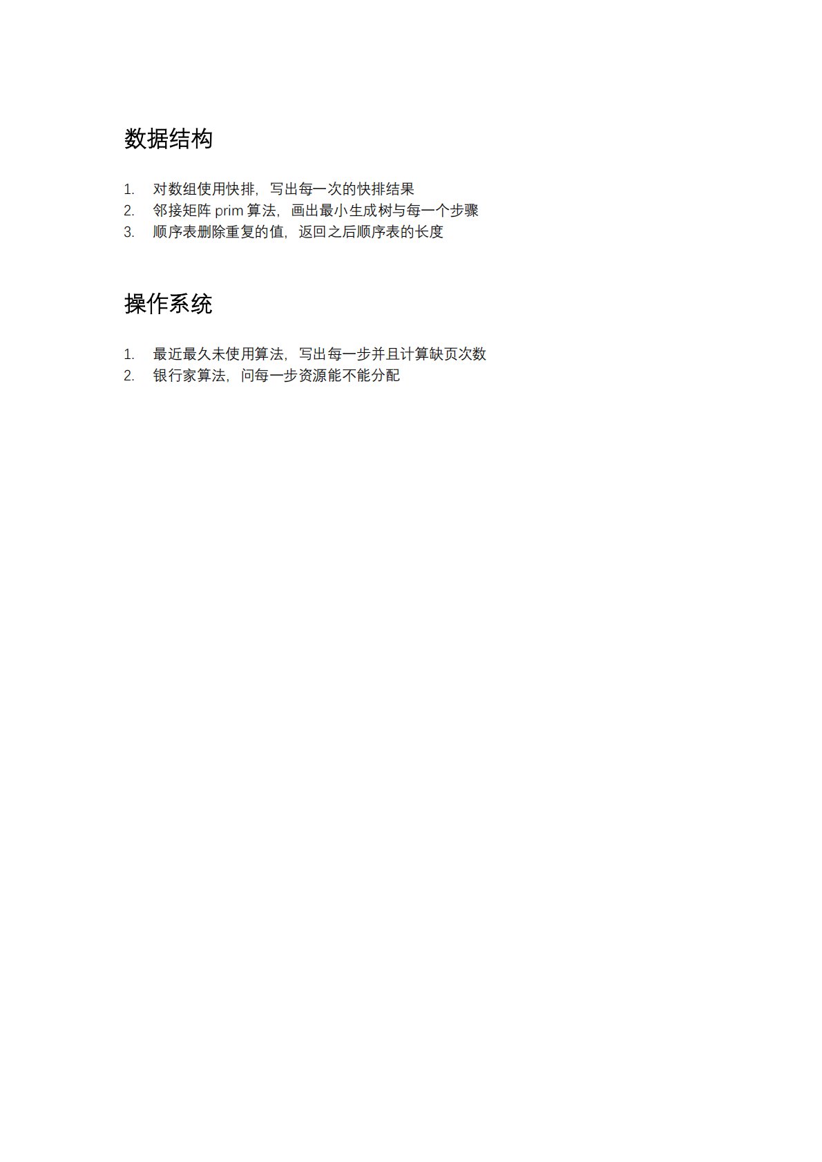 数据结构1.对数组使用快排,写出每一次的快排结果2.邻接矩阵prim算法,画出最小生成树与每一个步骤3.顺序表删除重复的值,返回之后顺序表的长度操作系统1.最近最久未使用算法,写出每一步并且计算缺页次数2.银行家算法,问每一步资源能不能分配数据结构1.对数组使用快排,写出每一次的快排结果2.邻接矩阵prim算法,画出最小生成树与每一个步骤3.顺序表删除重复的值,返回之后顺序表的长度操作系统1.最近最久未使用算法,写出每一步并且计算缺页次数2.银行家算法,问每一步资源能不能分配3.进程、线程、管程区别和联系4.简述假脱机技术的原理,工作流程5.Pv操作,一个教授60个学生,只有一个门,同时只能允...