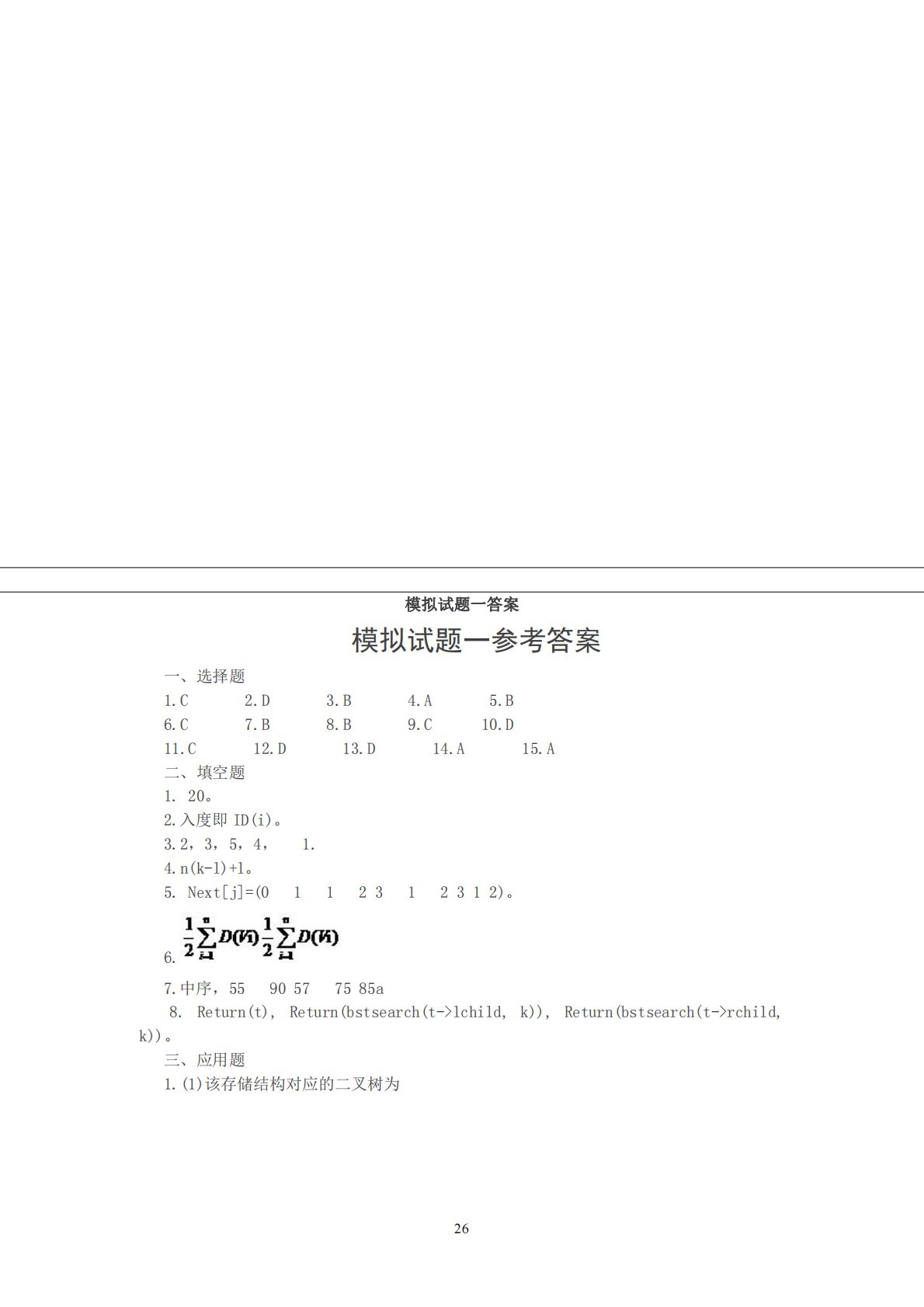 26模拟试题一答案模拟试题一参考答案一、选择题1.C2.D3.B4.A5.B6.C7.B8.B9.C10.D11.C12.D13.D14.A15.A二、填空题1.20。2.入度即ID(i)。3.2,3,5,4,1.4.n(k-l)+l。5.Next[j]=(0112312312)。6.7.中序,5590577585a8.Return(t),Return(bstsearch(t->lchild,k)),Return(bstsearch(t->rchild,k))。三、应用题1.(1)该存储结构对应的二叉树为2018年全国攻读硕士学位研究生入学考试试题27(2)先序序列为EADCBFHGI。中序序...