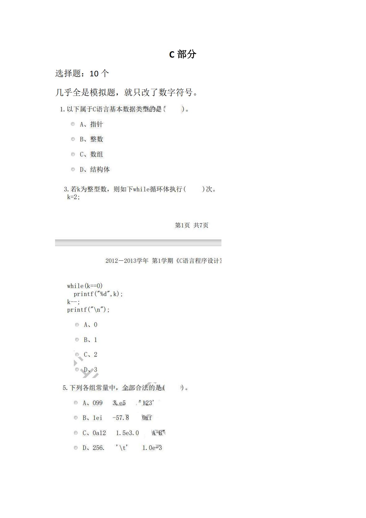 C部分选择题:10个几乎全是模拟题,就只改了数字符号。填空题:5个问答题:5个用变量P写声明1.5个整数的数组2.指向整数的指针3.一个整数变量程序题:2个1.数据结构课本原题:键盘读入字符串,从小到大排序,然后写入文件中。2.将一个字符串中的元音字母放到另一个字符串中,返回没有元音字母的字符串。数据结构选择题:10个1.时间复杂度类似3.求叶子节点数4.无向图概念5.堆概念6.二叉树遍历7.排序8.哈夫曼编码填空题:5个1.链表2.排序3.叶子节点4.栈5.二叉树应用题:3个1.求解最小生成树2.散列表3.队列算法题:2个1.二叉树层序遍历前N个元素值2.找出二叉树中最小元素。百校文库—海量...
