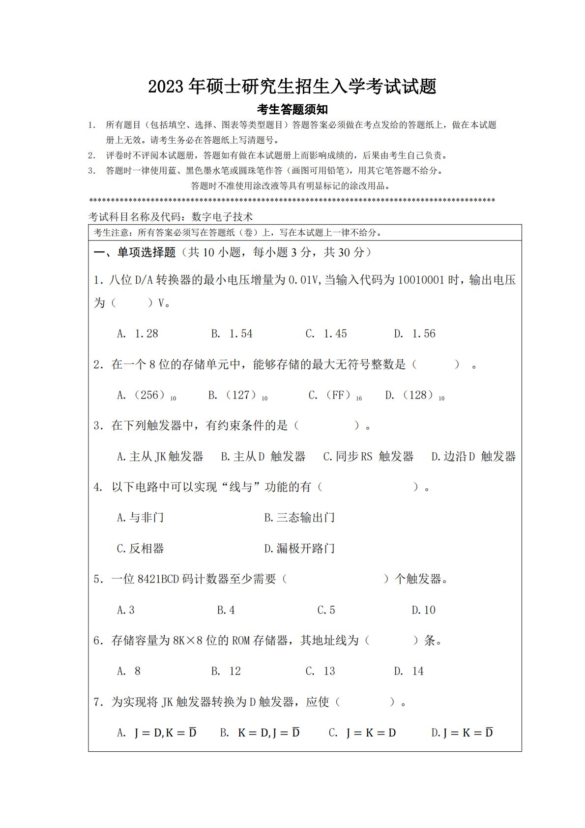2023年硕士研究生招生入学考试试题考生答题须知1.所有题目(包括填空、选择、图表等类型题目)答题答案必须做在考点发给的答题纸上,做在本试题册上无效。请考生务必在答题纸上写清题号。2.评卷时不评阅本试题册,答题如有做在本试题册上而影响成绩的,后果由考生自己负责。3.答题时一律使用蓝、黑色墨水笔或圆珠笔作答(画图可用铅笔),用其它笔答题不给分。答题时不准使用涂改液等具有明显标记的涂改用品。********************************************************************************************考试科目名称及代码:数字电...