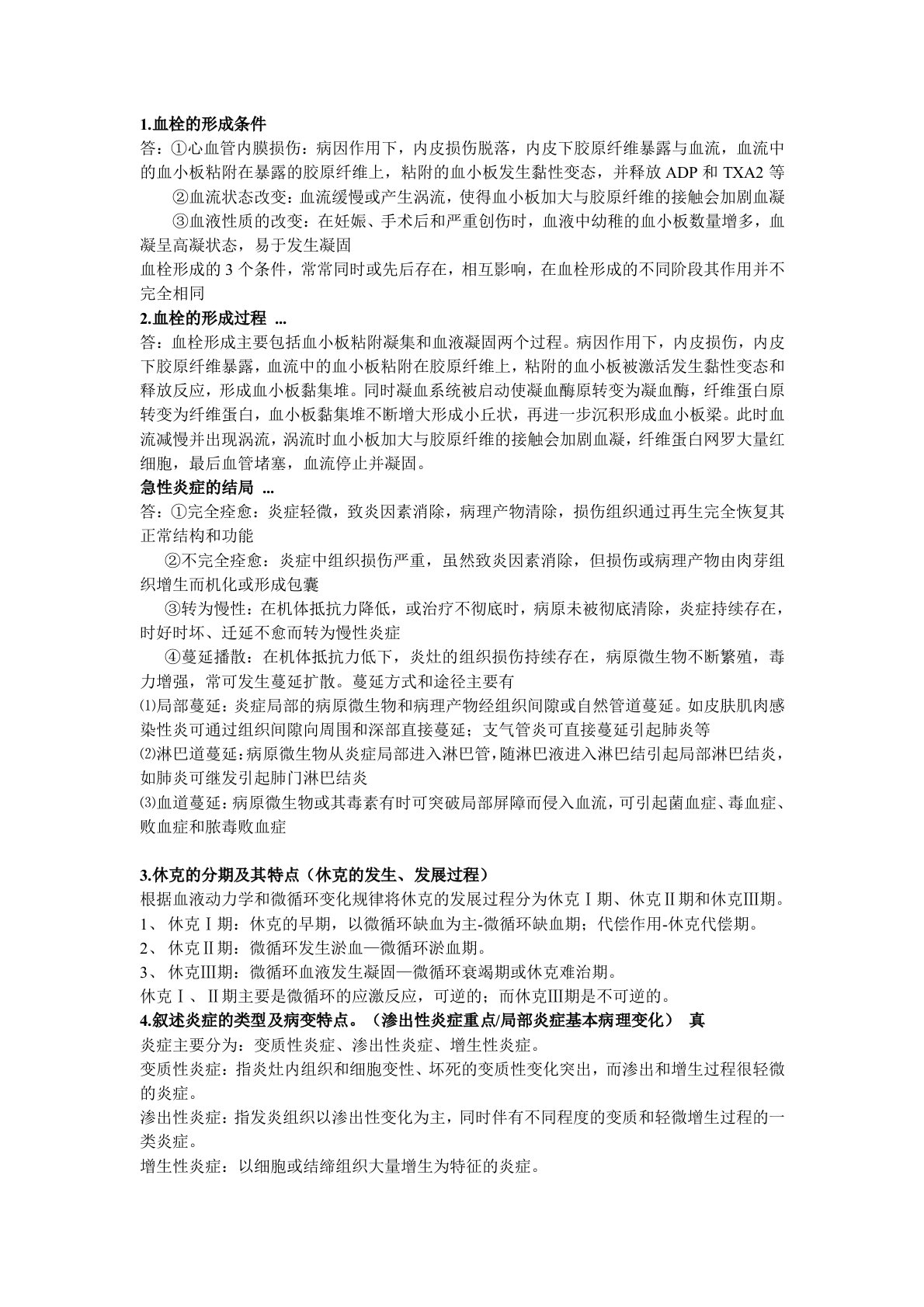 血栓的形成条件答:①心血管内膜损伤:病因作用下,内皮损伤脱落,内皮下胶原纤维暴露与血流,血流中的血小板粘附在暴露的胶原纤维上,粘附的血小板发生黏性变态,并释放ADP和TXA2等②血流状态改变:血流缓慢或产生涡流,使得血小板加大与胶原纤维的接触会加剧血凝③血液性质的改变:在妊娠、手术后和严重创伤时,血液中幼稚的血小板数量增多,血凝呈高凝状态,易于发生凝固血栓形成的3个条件,常常同时或先后存在,相互影响,在血栓形成的不同阶段其作用并不完全相同2.血栓的形成过程...答:血栓形成主要包括血小板粘附凝集和血液凝固两个过程。病因作用下,内皮损伤,内皮下胶原纤维暴露,血流中的血小板粘附在胶原纤维上,粘附的...