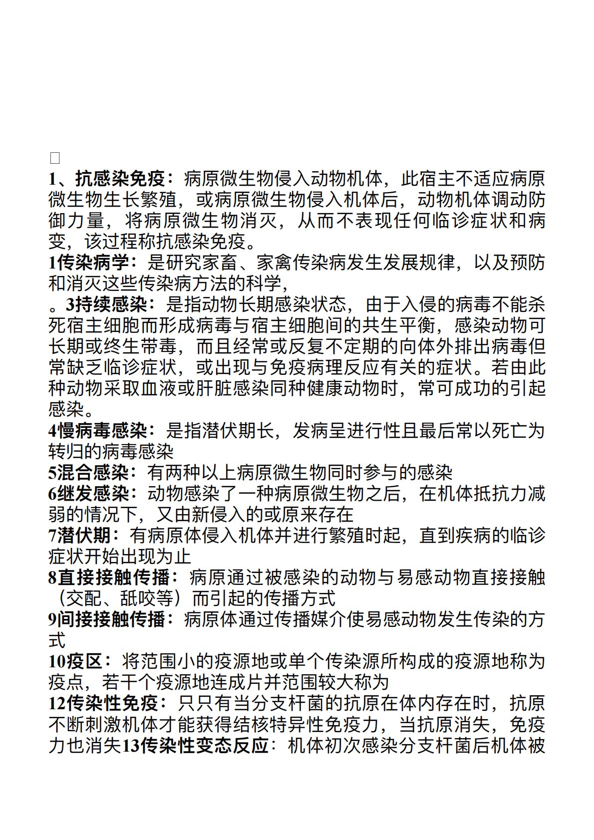 1、抗感染免疫:病原微⽣物侵⼊动物机体,此宿主不适应病原微⽣物⽣⻓繁殖,或病原微⽣物侵⼊机体后,动物机体调动防御⼒,将病原微⽣物消灭,从⽽不表现任何临诊症状和病变,该过程称抗感染免疫。1传染病学:是研究家畜、家禽传染病发⽣发展规律,以及预防和消灭这些传染病⽅法的科学,。3持续感染:是指动物⻓期感染状态,由于⼊侵的病毒不能杀死宿主细胞⽽形成病毒与宿主细胞间的共⽣平衡,感染动物可⻓期或终⽣带毒,⽽且经常或反复不定期的向体外排出病毒但常缺乏临诊症状,或出现与免疫病理反应有关的症状。若由此种动物采取⾎液或肝脏感染同种健康动物时,常可成功的引起感染。4慢病毒感染:是指潜伏期⻓,发病呈进⾏性且最后常以...
