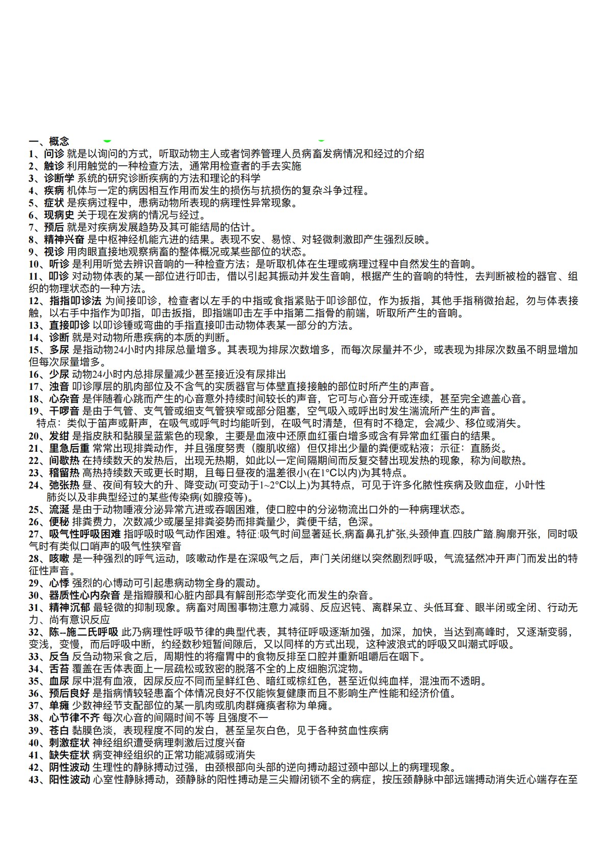 ⼼室性静脉搏动,颈静脉的阳性搏动是三尖瓣闭锁不全的病症,按压颈静脉中部远端搏动消失近⼼端存在⾄阳性波动、43⽣理性的静脉搏动过强,由颈根部向头部的逆向搏动超过颈中部以上的病理现象。阴性波动、42病变神经组织的正常功能减弱或消失缺失症状、41神经组织遭受病理刺激后过度兴奋刺激症状、40黏膜⾊淡,表现程度不同的发⽩,甚⾄呈灰⽩⾊,⻅于各种贫⾎性疾病苍⽩、39且强度不⼀每次⼼⾳的间隔时间不等⼼节律不⻬、38少数神经节⽀配部位的某⼀肌⾁或肌⾁群瘫痪者称为单瘫。单瘫、37是指病情较轻患畜个体情况良好不仅能恢复健康⽽且不影响⽣产性能和经济价值。预后良好、36尿中混有⾎液,因尿反应不同⽽呈鲜红⾊、暗红或棕红...
