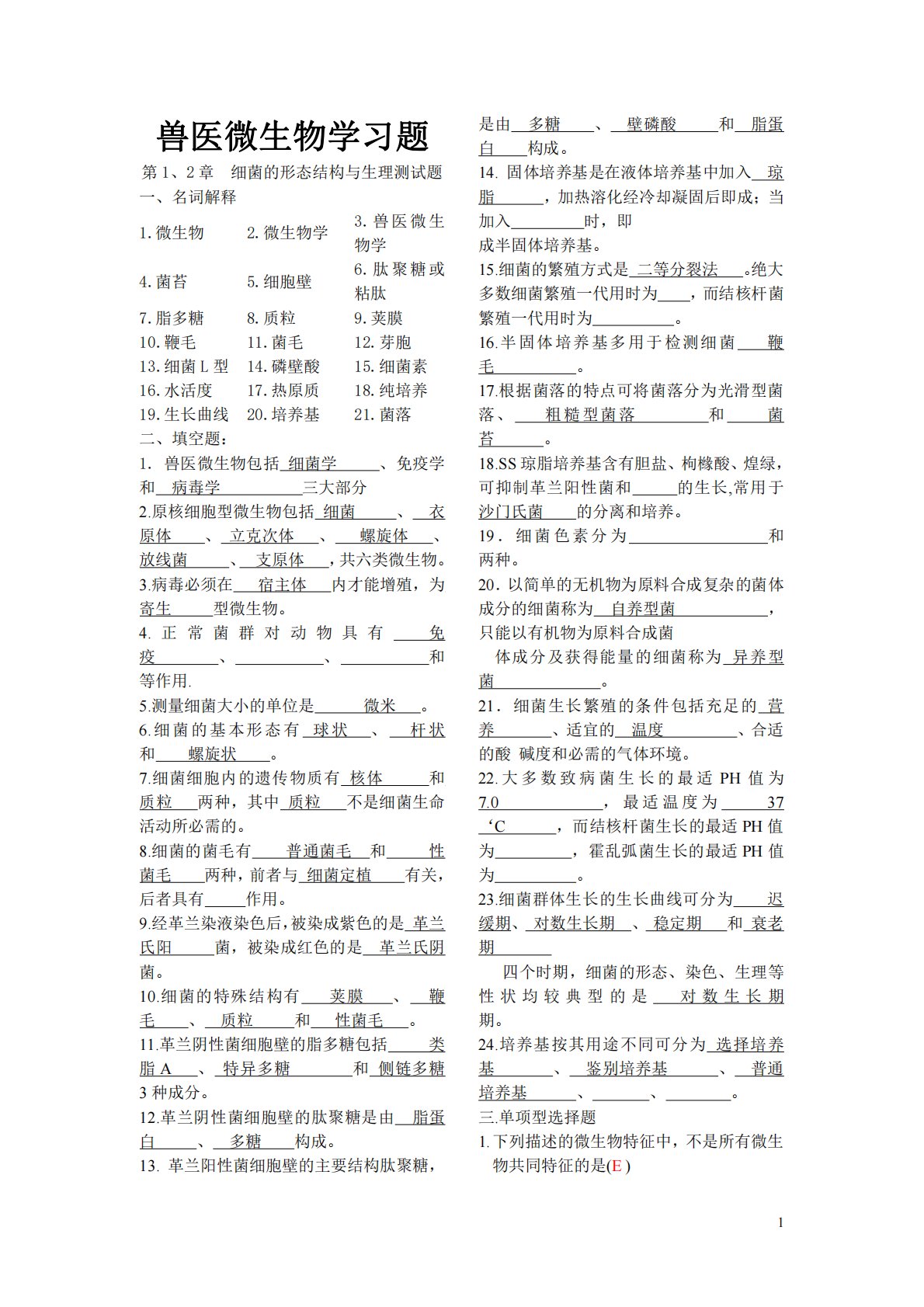 1兽医微生物学习题第1、2章细菌的形态结构与生理测试题一、名词解释1.微生物2.微生物学3.兽医微生物学4.菌苔5.细胞壁6.肽聚糖或粘肽7.脂多糖8.质粒9.荚膜10.鞭毛11.菌毛12.芽胞13.细菌L型14.磷壁酸15.细菌素16.水活度17.热原质18.纯培养19.生长曲线20.培养基21.菌落二、填空题:1.兽医微生物包括细菌学、免疫学和病毒学三大部分2.原核细胞型微生物包括细菌、衣原体、立克次体、螺旋体、放线菌、支原体,共六类微生物。3.病毒必须在宿主体内才能增殖,为寄生型微生物。4.正常菌群对动物具有免疫、、和等作用.5.测量细菌大小的单位是微米。6.细菌的基本形态有球状、杆状和...