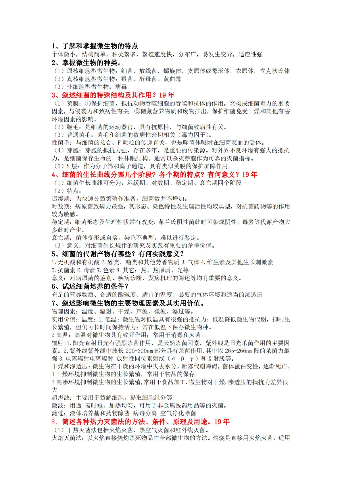 1、了解和掌握微生物的特点个体微小,结构简单,种类繁多,繁殖速度快,分布广,易发生变异,适应性强2、掌握微生物的种类。(1)原核细胞型微生物:细菌,放线菌,螺旋体,支原体或霉形体,衣原体,立克次氏体(2)真核细胞型微生物:霉菌、酵母菌、黄曲霉(3)非细胞型微生物:病毒3、叙述细菌的特殊结构及其作用?19年(1)荚膜:①保护细菌,抵抗动物吞噬细胞的吞噬和抗体的作用。②构成细菌毒力的重要因素,与侵袭力和致病性有关。③储藏营养物质和废物排出,保护细菌免受干燥和其他有害环境因素的影响。(2)鞭毛:是细菌的运动器官,具有抗原性,与细菌致病性有关。(3)普通菌毛:菌毛和细菌的致病性密切相关(毒力因子)。性...