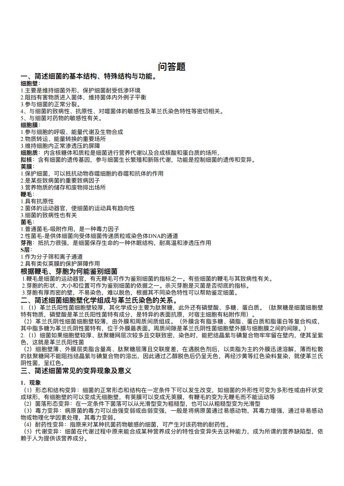 问答题⼀、简述细菌的基本结构、特殊结构与功能。细胞壁:1.主要是维持细菌外形,保护细菌耐受低渗环境2.阻挡有害物质进⼊菌体,维持菌体内外例⼦平衡3.参与细菌的正常分裂。4、与细菌的致病性、抗原性、对噬菌体的敏感性及⾰兰⽒染⾊特性等密切相关。5、与细菌对药物的敏感性有关。细胞膜:1.参与细胞的呼吸、能量代谢及⽣物合成2.物质转运、能量转换的重要场所3.维持细胞内正常渗透压的屏障细胞质:内含核糖体和质粒是细菌进⾏营养代谢以及合成核酸和蛋⽩质的场所,拟核:含有细菌的遗传基因,参与细菌⽣⻓繁殖和新陈代谢,功能是控制细菌的遗传和变异。荚膜:1.保护细菌,可以抵抗动物吞噬细胞的吞噬和抗体的作⽤2.是某些致...