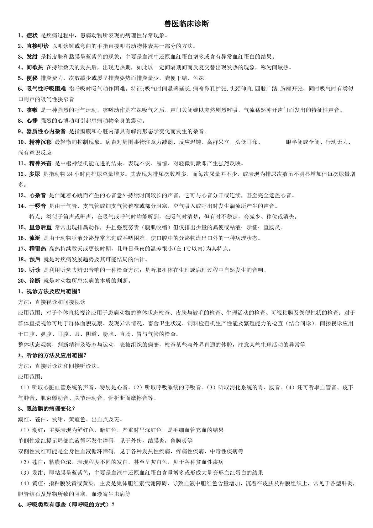 兽医临床诊断1、症状是疾病过程中,患病动物所表现的病理性异常现象。2、直接叩诊以叩诊锤或弯曲的手指直接叩击动物体表某一部分的方法。3、发绀是指皮肤和黏膜呈蓝紫色的现象,主要是血液中还原血红蛋白增多或含有异常血红蛋白的结果。4、间歇热在持续数天的发热后,出现无热期,如此以一定间隔期间而反复交替出现发热的现象,称为间歇热。5、便秘排粪费力,次数减少或屡呈排粪姿势而排粪量少,粪便干结,色深。6、吸气性呼吸困难指呼吸时吸气动作困难。特征:吸气时间显著延长,病畜鼻孔扩张,头颈伸直.四肢广踏.胸廓开张,同时吸气时有类似口哨声的吸气性狭窄音7、咳嗽是一种强烈的呼气运动,咳嗽动作是在深吸气之后,声门关闭继以突...