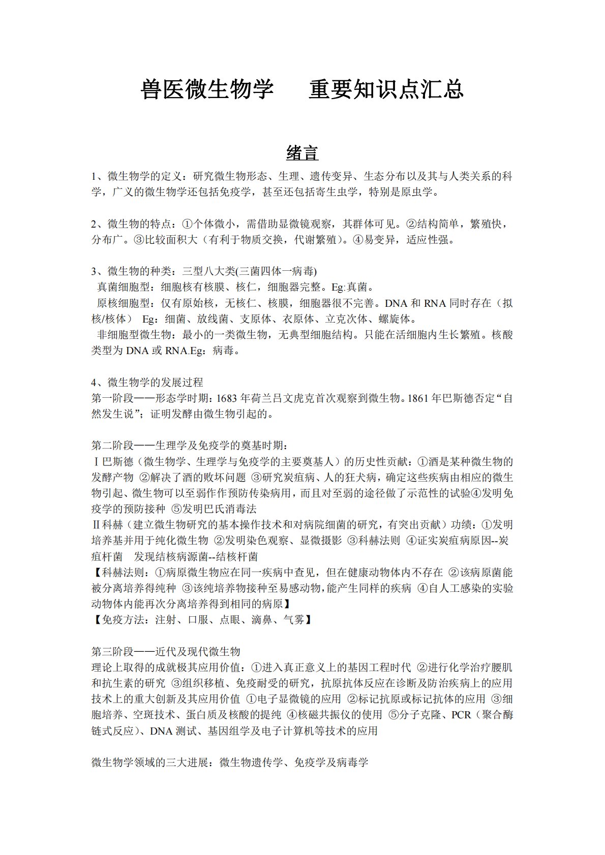兽医微生物学重要知识点汇总绪言1、微生物学的定义:研究微生物形态、生理、遗传变异、生态分布以及其与人类关系的科学,广义的微生物学还包括免疫学,甚至还包括寄生虫学,特别是原虫学。2、微生物的特点:①个体微小,需借助显微镜观察,其群体可见。②结构简单,繁殖快,分布广。③比较面积大(有利于物质交换,代谢繁殖)。④易变异,适应性强。3、微生物的种类:三型八大类(三菌四体一病毒)真菌细胞型:细胞核有核膜、核仁,细胞器完整。Eg:真菌。原核细胞型:仅有原始核,无核仁、核膜,细胞器很不完善。DNA和RNA同时存在(拟核/核体)Eg:细菌、放线菌、支原体、衣原体、立克次体、螺旋体。非细胞型微生物:最小的一类微...