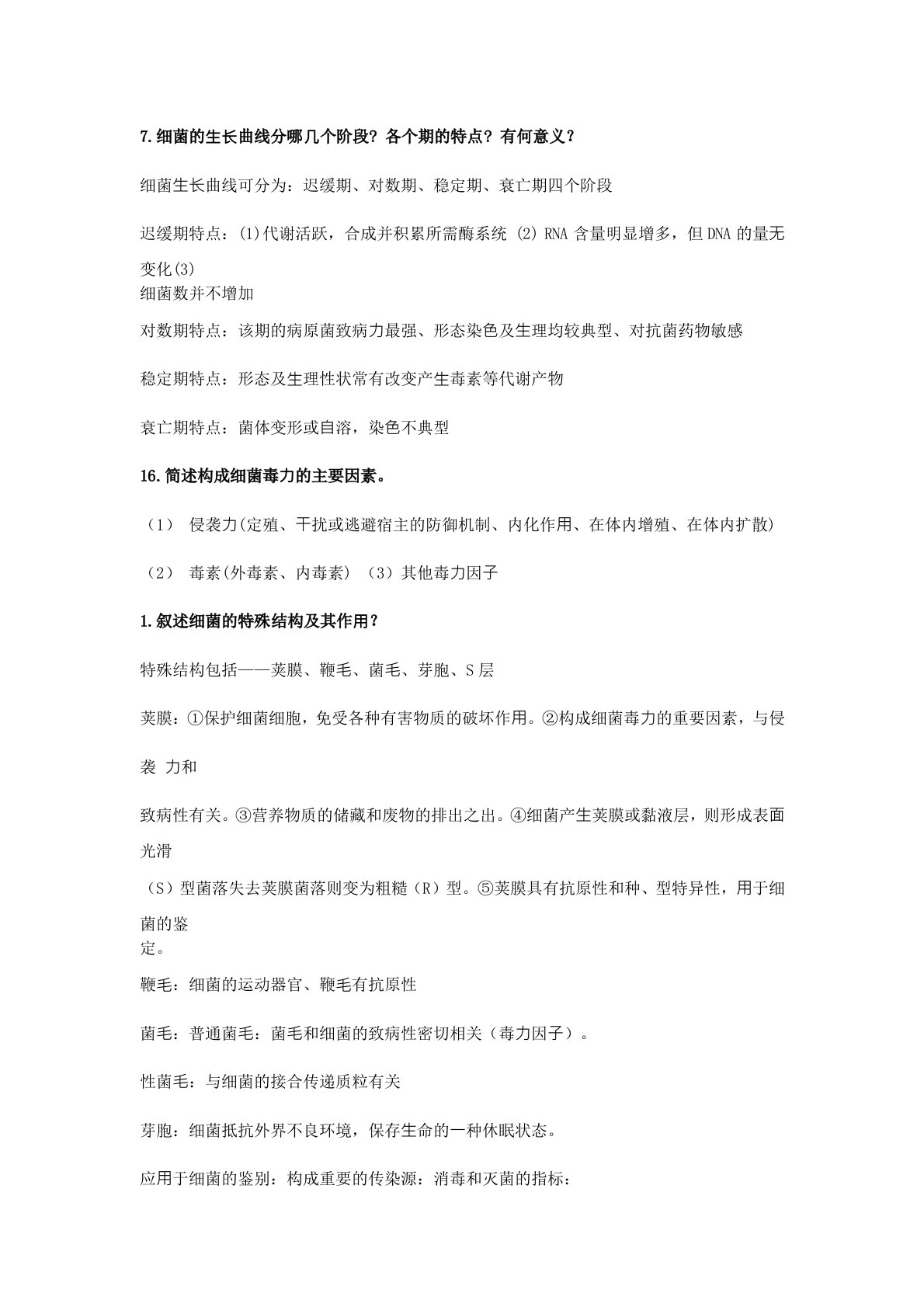 7.细菌的⽣⻓曲线分哪⼏个阶段?各个期的特点?有何意义?细菌⽣⻓曲线可分为:迟缓期、对数期、稳定期、衰亡期四个阶段迟缓期特点:(1)代谢活跃,合成并积累所需酶系统(2)RNA含量明显增多,但DNA的量⽆变化(3)细菌数并不增加对数期特点:该期的病原菌致病⼒最强、形态染⾊及⽣理均较典型、对抗菌药物敏感稳定期特点:形态及⽣理性状常有改变产⽣毒素等代谢产物衰亡期特点:菌体变形或⾃溶,染⾊不典型16.简述构成细菌毒⼒的主要因素。(1)侵袭⼒(定殖、⼲扰或逃避宿主的防御机制、内化作⽤、在体内增殖、在体内扩散)(2)毒素(外毒素、内毒素)(3)其他毒⼒因⼦1.叙述细菌的特殊结构及其作⽤?特殊结构包括——荚...