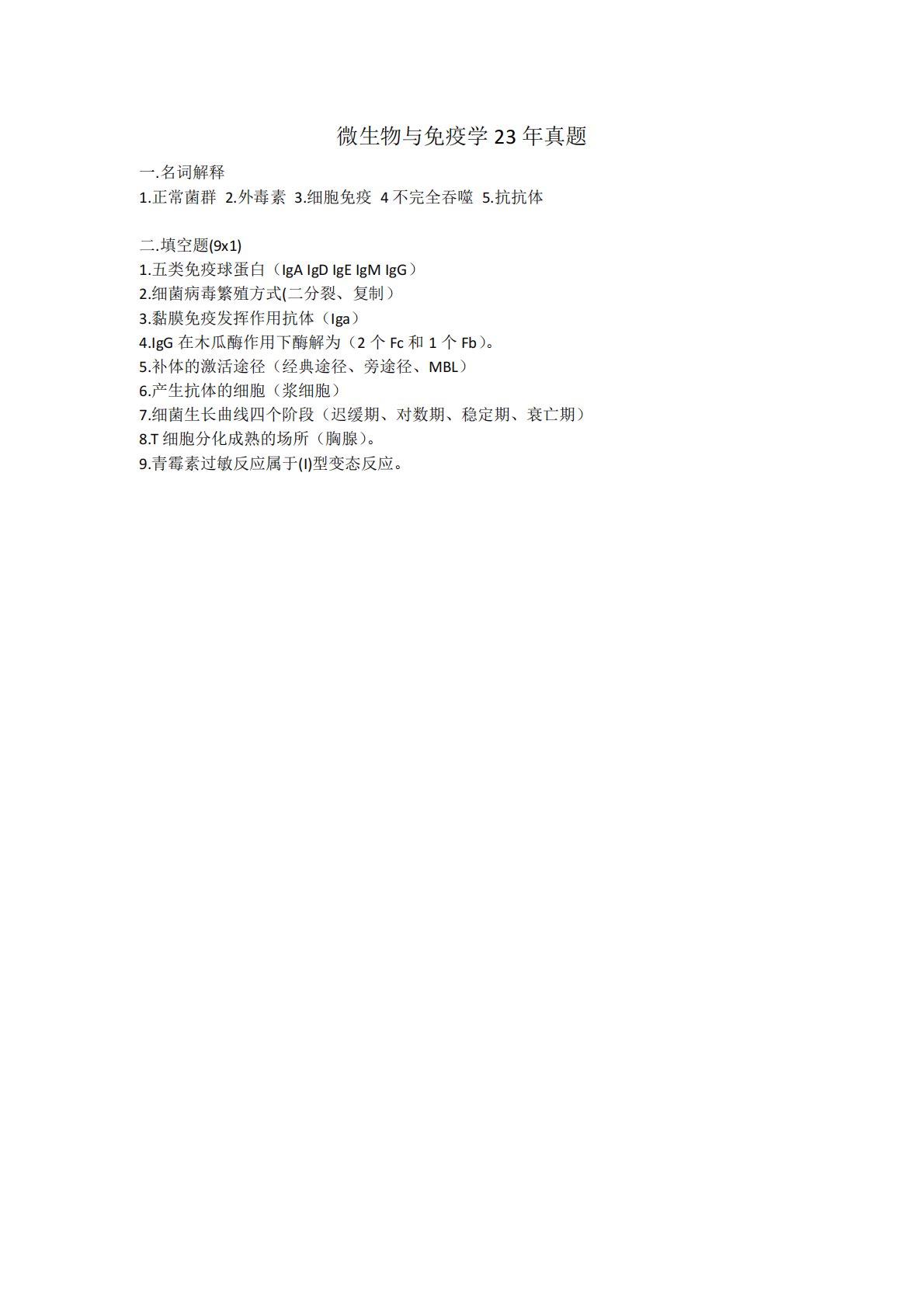 微生物与免疫学23年真题一.名词解释1.正常菌群2.外毒素3.细胞免疫4不完全吞噬5.抗抗体二.填空题(9x1)1.五类免疫球蛋白(IgAIgDIgEIgMIgG)2.细菌病毒繁殖方式(二分裂、复制)3.黏膜免疫发挥作用抗体(Iga)4.IgG在木瓜酶作用下酶解为(2个Fc和1个Fb)。5.补体的激活途径(经典途径、旁途径、MBL)6.产生抗体的细胞(浆细胞)7.细菌生长曲线四个阶段(迟缓期、对数期、稳定期、衰亡期)8.T细胞分化成熟的场所(胸腺)。9.青霉素过敏反应属于(I)型变态反应。微生物与免疫学23年真题一.名词解释1.正常菌群2.外毒素3.细胞免疫4不完全吞噬5.抗抗体二.填空题(9...