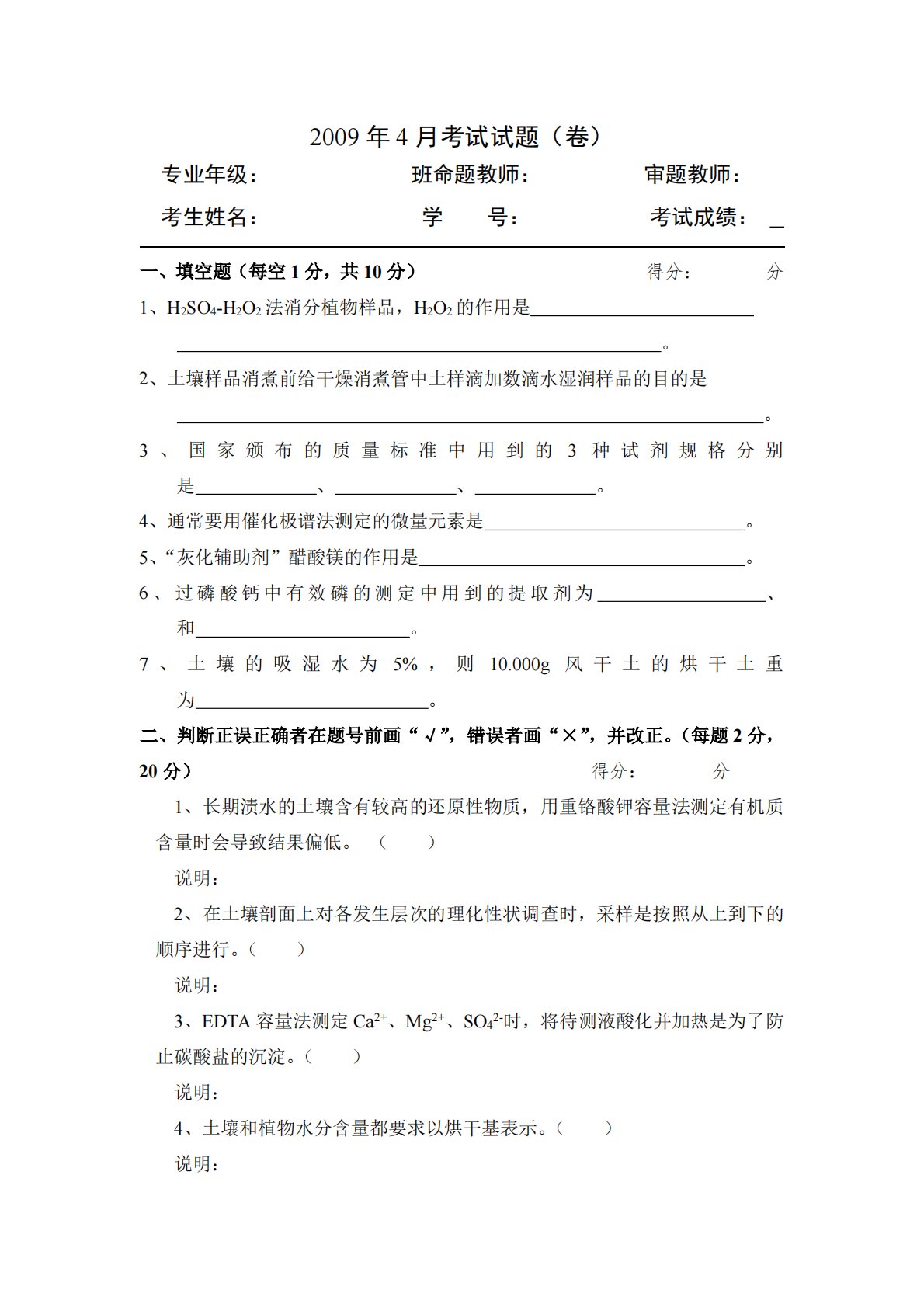 2009年4月考试试题(卷)专业年级:班命题教师:审题教师:考生姓名:学号:考试成绩:一、填空题(每空1分,共10分)得分:分1、H2SO4-H2O2法消分植物样品,H2O2的作用是。2、土壤样品消煮前给干燥消煮管中土样滴加数滴水湿润样品的目的是。3、国家颁布的质量标准中用到的3种试剂规格分别是、、。4、通常要用催化极谱法测定的微量元素是。5、“灰化辅助剂”醋酸镁的作用是。6、过磷酸钙中有效磷的测定中用到的提取剂为、和。7、土壤的吸湿水为5%,则10.000g风干土的烘干土重为。二、判断正误正确者在题号前画“√”,错误者画“×”,并改正。(每题2分,20分)得分:分1、长期渍水的土壤含有较高的...