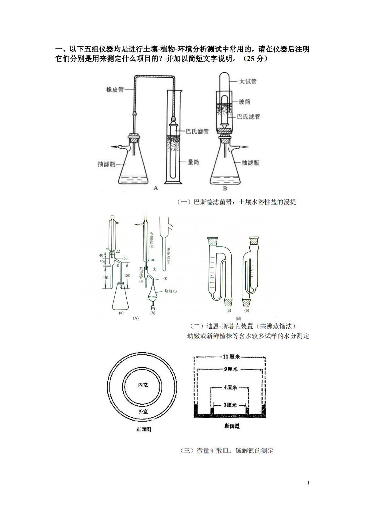 1一、以下五组仪器均是进行土壤-植物-环境分析测试中常用的,请在仪器后注明它们分别是用来测定什么项目的?并加以简短文字说明。(25分)(一)巴斯德滤菌器:土壤水溶性盐的浸提(二)迪恩-斯塔克装置(共沸蒸馏法)幼嫩或新鲜植株等含水较多试样的水分测定(三)微量扩散皿:碱解氮的测定2(四)蒸馏装置图(尿素和铵态氮肥总氮含量的测定)(五)气量法测定碳酸钙的装置3二、选做题。(任选3道简答,每题15分,共45分。多选不加分。)1.土壤有机质测定的基本原理。2.说明凯氏法(开氏法)测定植物全氮含量的主要操作步骤。3.说明钒钼黄比色法测定植物体内全磷含量的方法原理。4.简述火焰光度计法测定土壤速效钾的方法原...