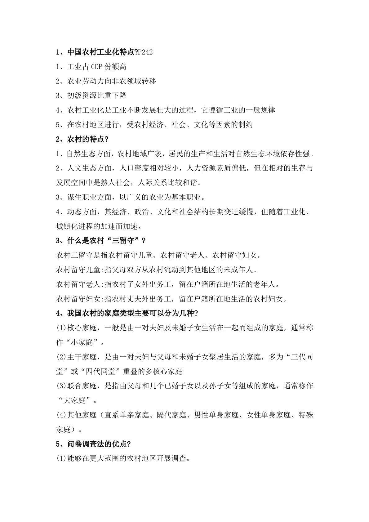 1、中国农村工业化特点?P2421、工业占GDP份额高2、农业劳动力向非农领域转移3、初级资源比重下降4、农村工业化是工业不断发展壮大的过程,它遵循工业的一般规律5、在农村地区进行,受农村经济、社会、文化等因素的制约2、农村的特点?1、自然生态方面,农村地域广袤,居民的生产和生活对自然生态环境依存性强。2、人文生态方面,人口密度相对较小,人力资源素质偏低,但在相对的生存与发展空间中是熟人社会,人际关系比较和谐。3、谋生职业方面,以广义的农业为基本职业。4、动态方面,其经济、政治、文化和社会结构长期变迁缓慢,但随着工业化、城镇化进程的加速而加速。3、什么是农村“三留守”?农村三留守是指农村留守儿...