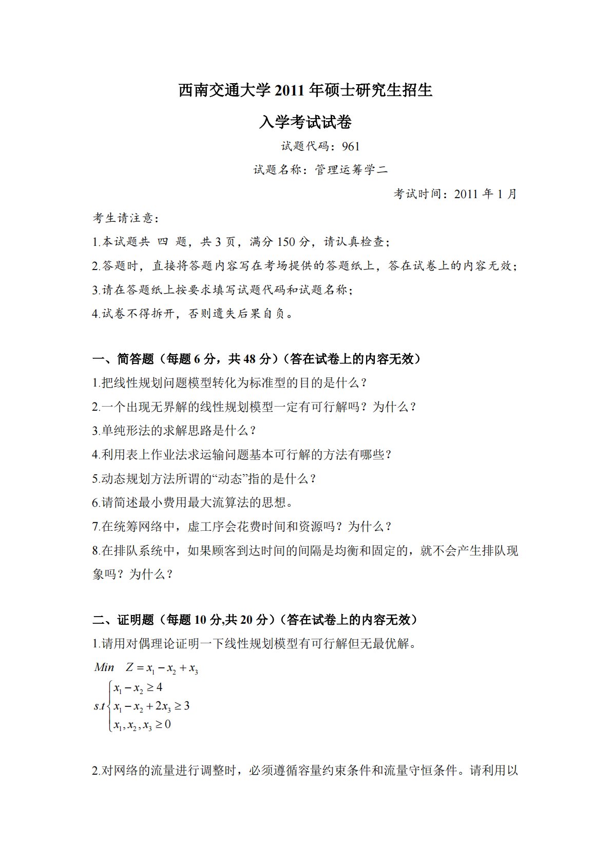西南交通大学2011年硕士研究生招生入学考试试卷试题代码:961试题名称:管理运筹学二考试时间:2011年1月考生请注意:1.本试题共四题,共3页,满分150分,请认真检查;2.答题时,直接将答题内容写在考场提供的答题纸上,答在试卷上的内容无效;3.请在答题纸上按要求填写试题代码和试题名称;4.试卷不得拆开,否则遗失后果自负。一、简答题(每题6分,共48分)(答在试卷上的内容无效)1.把线性规划问题模型转化为标准型的目的是什么?2.一个出现无界解的线性规划模型一定有可行解吗?为什么?3.单纯形法的求解思路是什么?4.利用表上作业法求运输问题基本可行解的方法有哪些?5.动态规划方法所谓的“动态”...