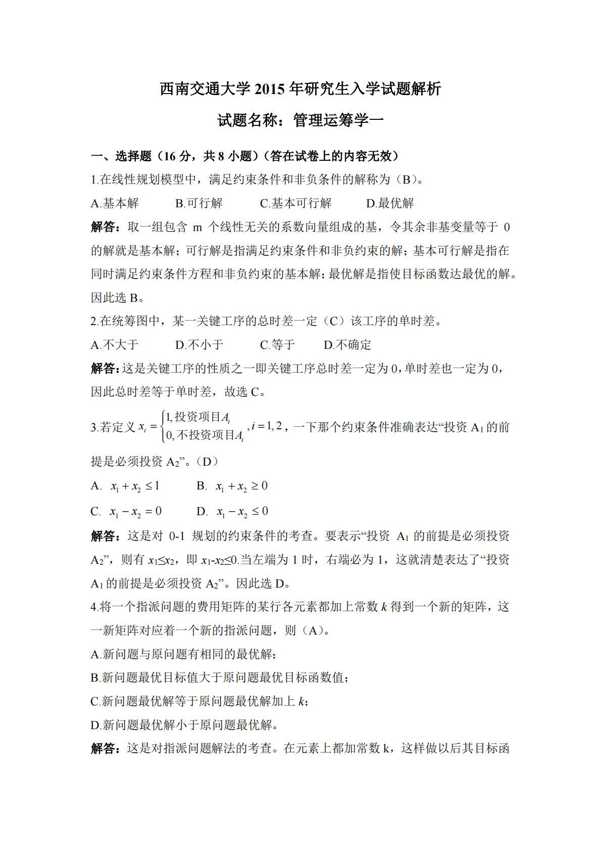 西南交通大学2015年研究生入学试题解析试题名称:管理运筹学一一、选择题(16分,共8小题)(答在试卷上的内容无效)1.在线性规划模型中,满足约束条件和非负条件的解称为(B)。A.基本解B.可行解C.基本可行解D.最优解解答:取一组包含m个线性无关的系数向量组成的基,令其余非基变量等于0的解就是基本解;可行解是指满足约束条件和非负约束的解;基本可行解是指在同时满足约束条件方程和非负约束的基本解;最优解是指使目标函数达最优的解。因此选B。2.在统筹图中,某一关键工序的总时差一定(C)该工序的单时差。A.不大于D.不小于C.等于D.不确定解答:这是关键工序的性质之一即关键工序总时差一定为0,单时差...
