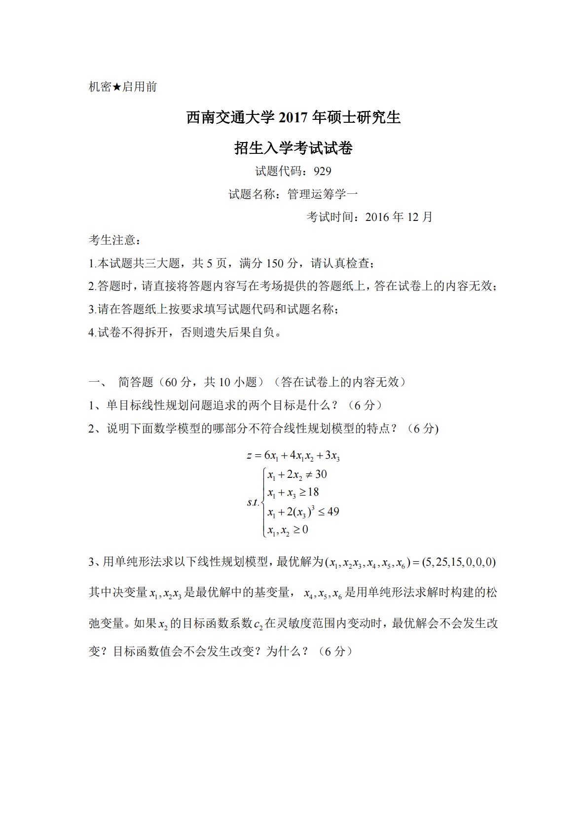 机密★启用前西南交通大学2017年硕士研究生招生入学考试试卷试题代码:929试题名称:管理运筹学一考试时间:2016年12月考生注意:1.本试题共三大题,共5页,满分150分,请认真检查;2.答题时,请直接将答题内容写在考场提供的答题纸上,答在试卷上的内容无效;3.请在答题纸上按要求填写试题代码和试题名称;4.试卷不得拆开,否则遗失后果自负。一、简答题(60分,共10小题)(答在试卷上的内容无效)1、单目标线性规划问题追求的两个目标是什么?(6分)2、说明下面数学模型的哪部分不符合线性规划模型的特点?(6分)112312133131264323018..2()49,0zxxxxxxxxstxx...