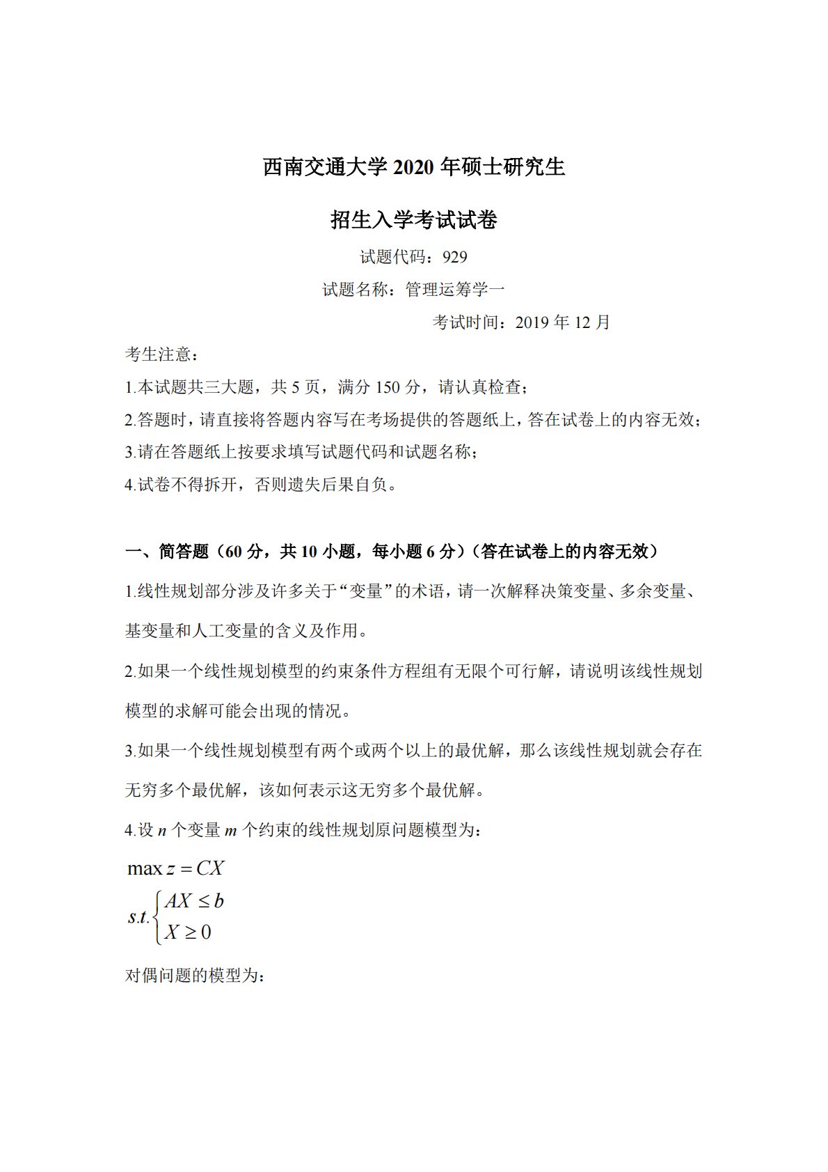 西南交通大学2020年硕士研究生招生入学考试试卷试题代码:929试题名称:管理运筹学一考试时间:2019年12月考生注意:1.本试题共三大题,共5页,满分150分,请认真检查;2.答题时,请直接将答题内容写在考场提供的答题纸上,答在试卷上的内容无效;3.请在答题纸上按要求填写试题代码和试题名称;4.试卷不得拆开,否则遗失后果自负。一、简答题(60分,共10小题,每小题6分)(答在试卷上的内容无效)1.线性规划部分涉及许多关于“变量”的术语,请一次解释决策变量、多余变量、基变量和人工变量的含义及作用。2.如果一个线性规划模型的约束条件方程组有无限个可行解,请说明该线性规划模型的求解可能会出现的情...