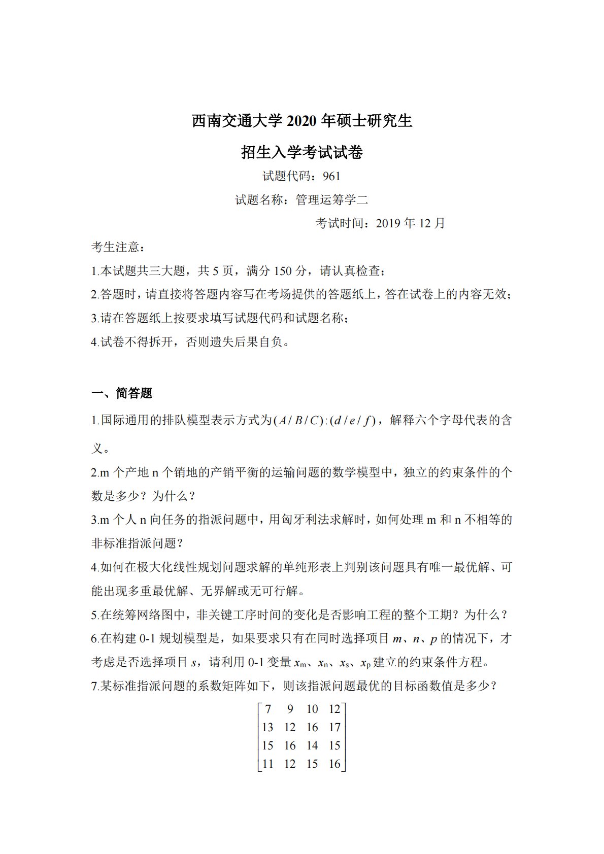 西南交通大学961管理运筹学2020年真题(专硕)