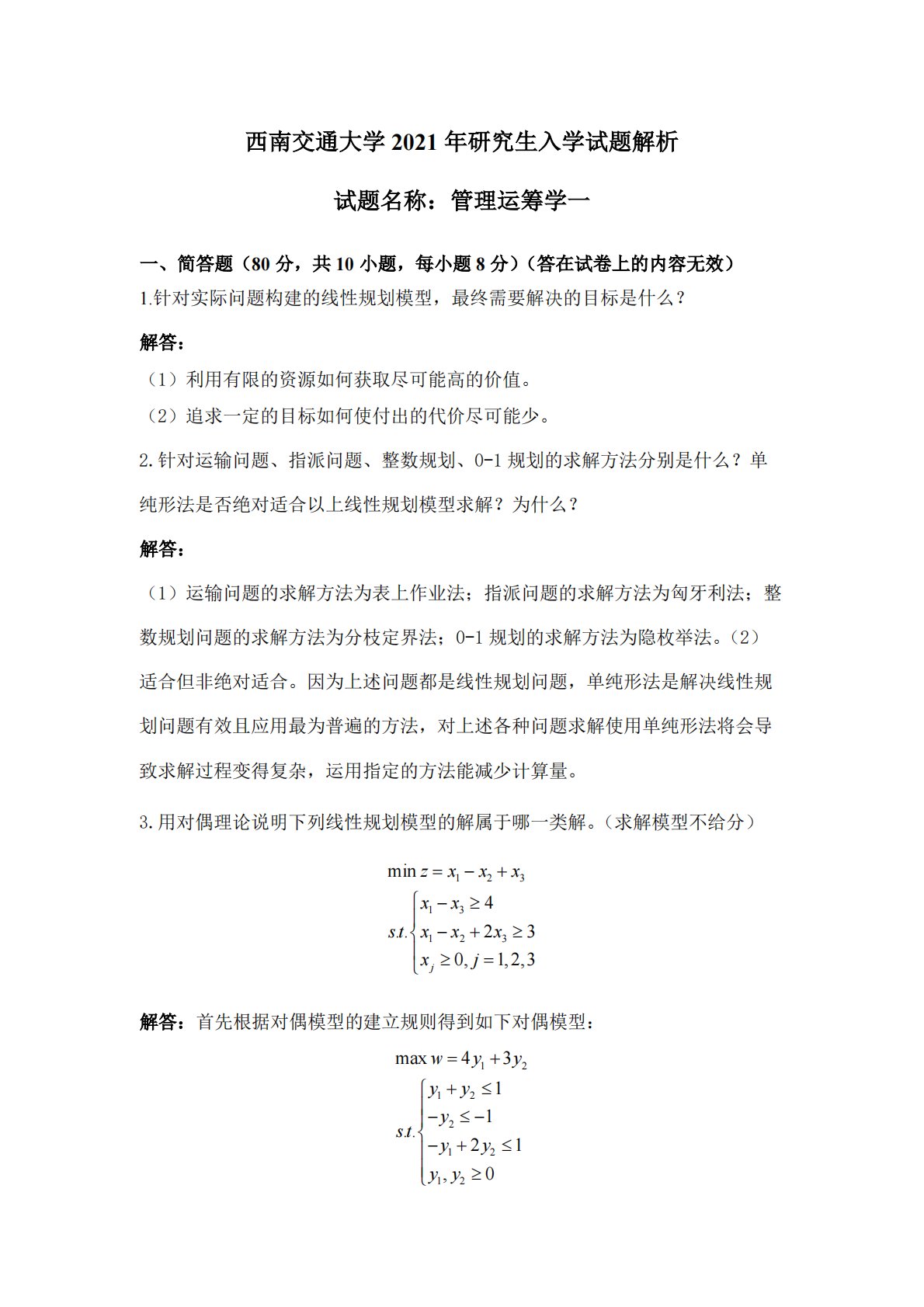 西南交通大学2021年研究生入学试题解析试题名称:管理运筹学一一、简答题(80分,共10小题,每小题8分)(答在试卷上的内容无效)1.针对实际问题构建的线性规划模型,最终需要解决的目标是什么?解答:(1)利用有限的资源如何获取尽可能高的价值。(2)追求一定的目标如何使付出的代价尽可能少。2.针对运输问题、指派问题、整数规划、0-1规划的求解方法分别是什么?单纯形法是否绝对适合以上线性规划模型求解?为什么?解答:(1)运输问题的求解方法为表上作业法;指派问题的求解方法为匈牙利法;整数规划问题的求解方法为分枝定界法;0-1规划的求解方法为隐枚举法。(2)适合但非绝对适合。因为上述问题都是线性规划问...