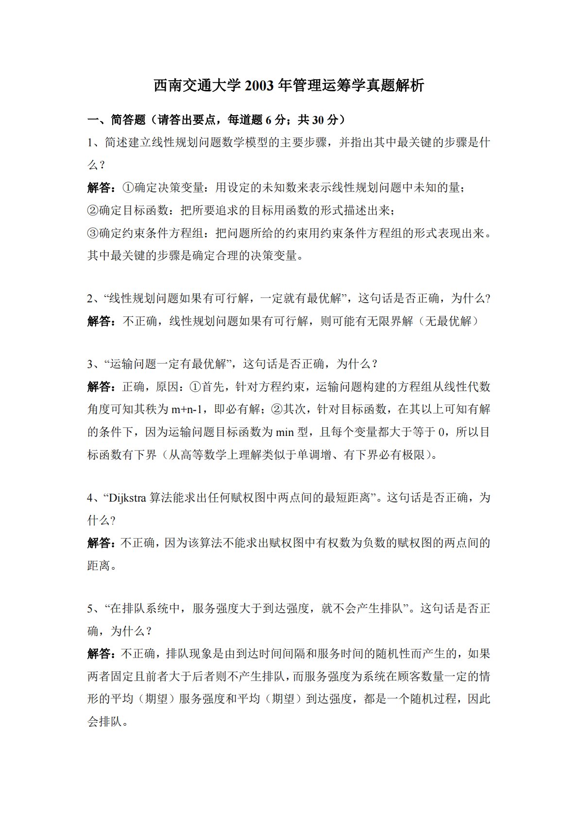 西南交通大学929管理运筹学2003年真题解析