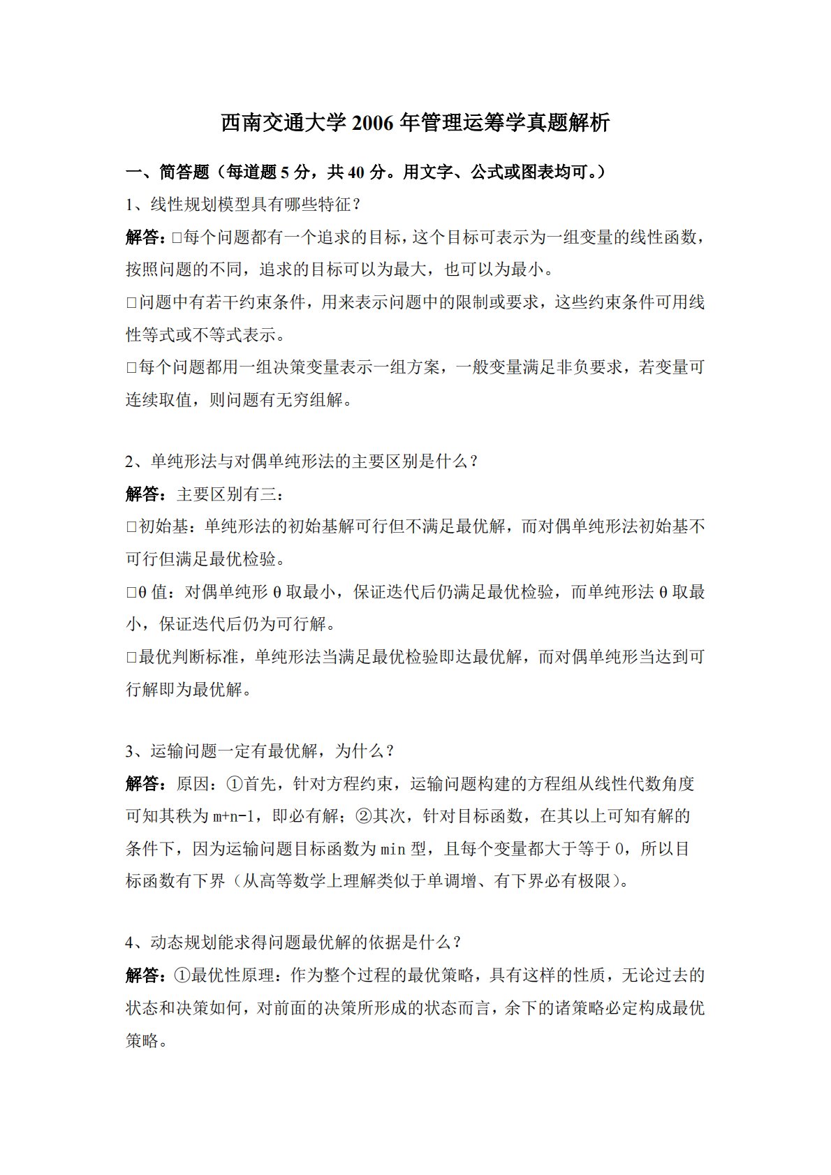 西南交通大学2006年管理运筹学真题解析一、简答题(每道题5分,共40分。用文字、公式或图表均可。)1、线性规划模型具有哪些特征?解答:�每个问题都有一个追求的目标,这个目标可表示为一组变量的线性函数,按照问题的不同,追求的目标可以为最大,也可以为最小。�问题中有若干约束条件,用来表示问题中的限制或要求,这些约束条件可用线性等式或不等式表示。�每个问题都用一组决策变量表示一组方案,一般变量满足非负要求,若变量可连续取值,则问题有无穷组解。2、单纯形法与对偶单纯形法的主要区别是什么?解答:主要区别有三:�初始基:单纯形法的初始基解可行但不满足最优解,而对偶单纯形法初始基不可行但满足最优检验。�θ...